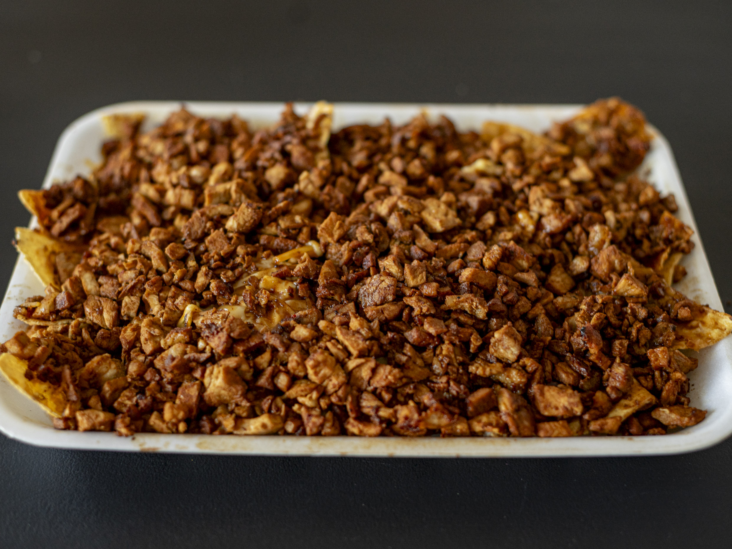 Nachos crujientes con carne al pastor y queso fundido, llenos de sabor.