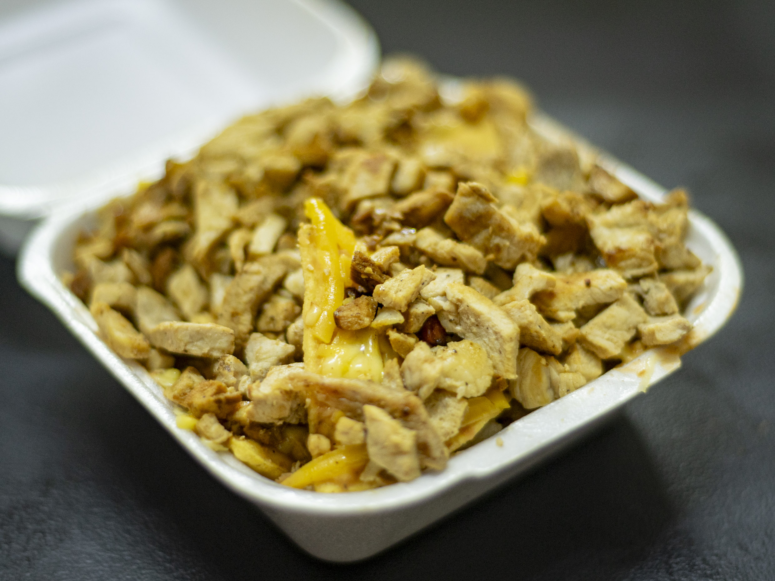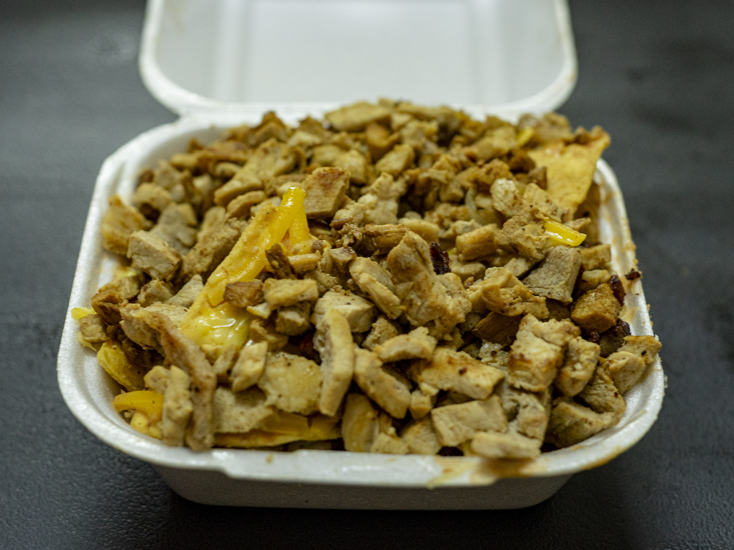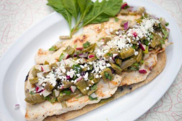 Carne de pechuga a la plancha, aderezada con nuestra receta secreta acompañada de tortillas, salsas, cebolla, limones, crema de ajo, charros y guacamole.
