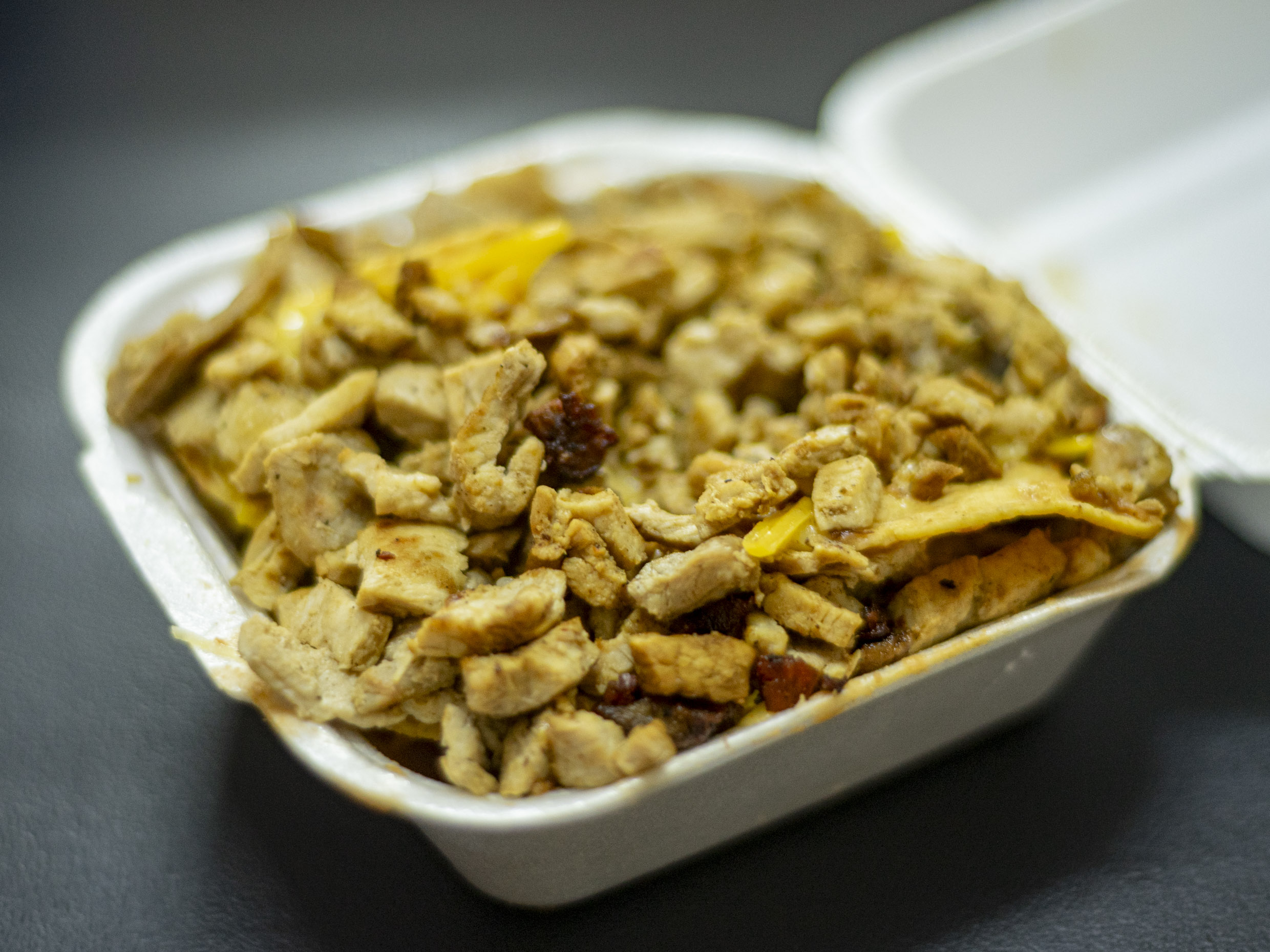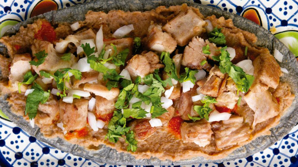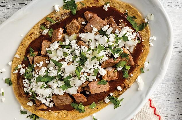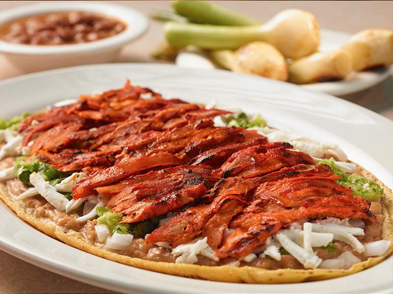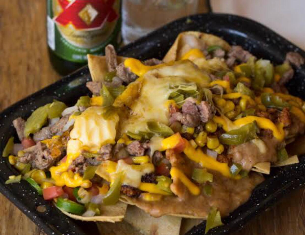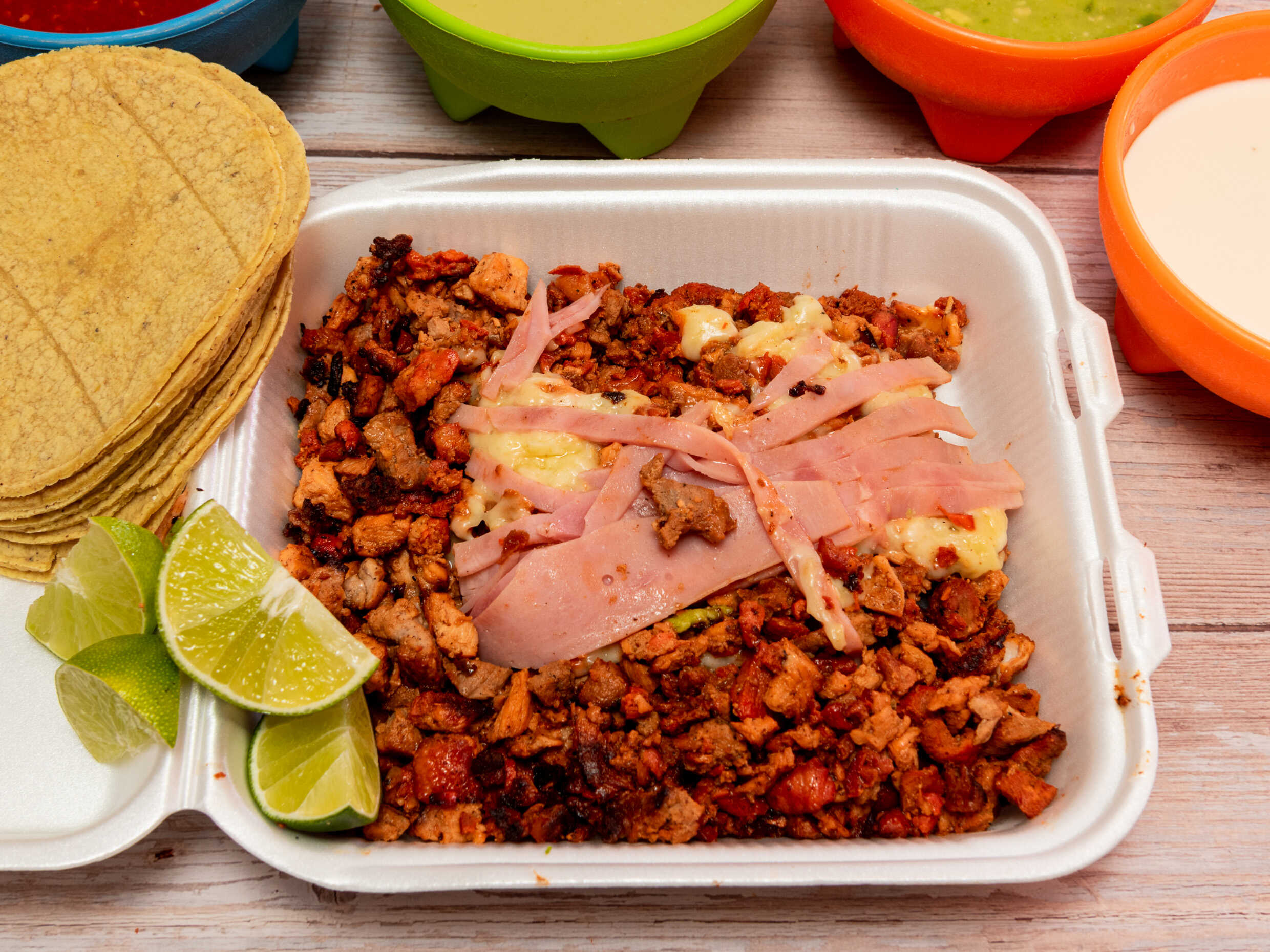 Capa de totopos con carne de pastor chuleta y bistec acompañado de tres tipos de salsa crema de ajo cebolla limones