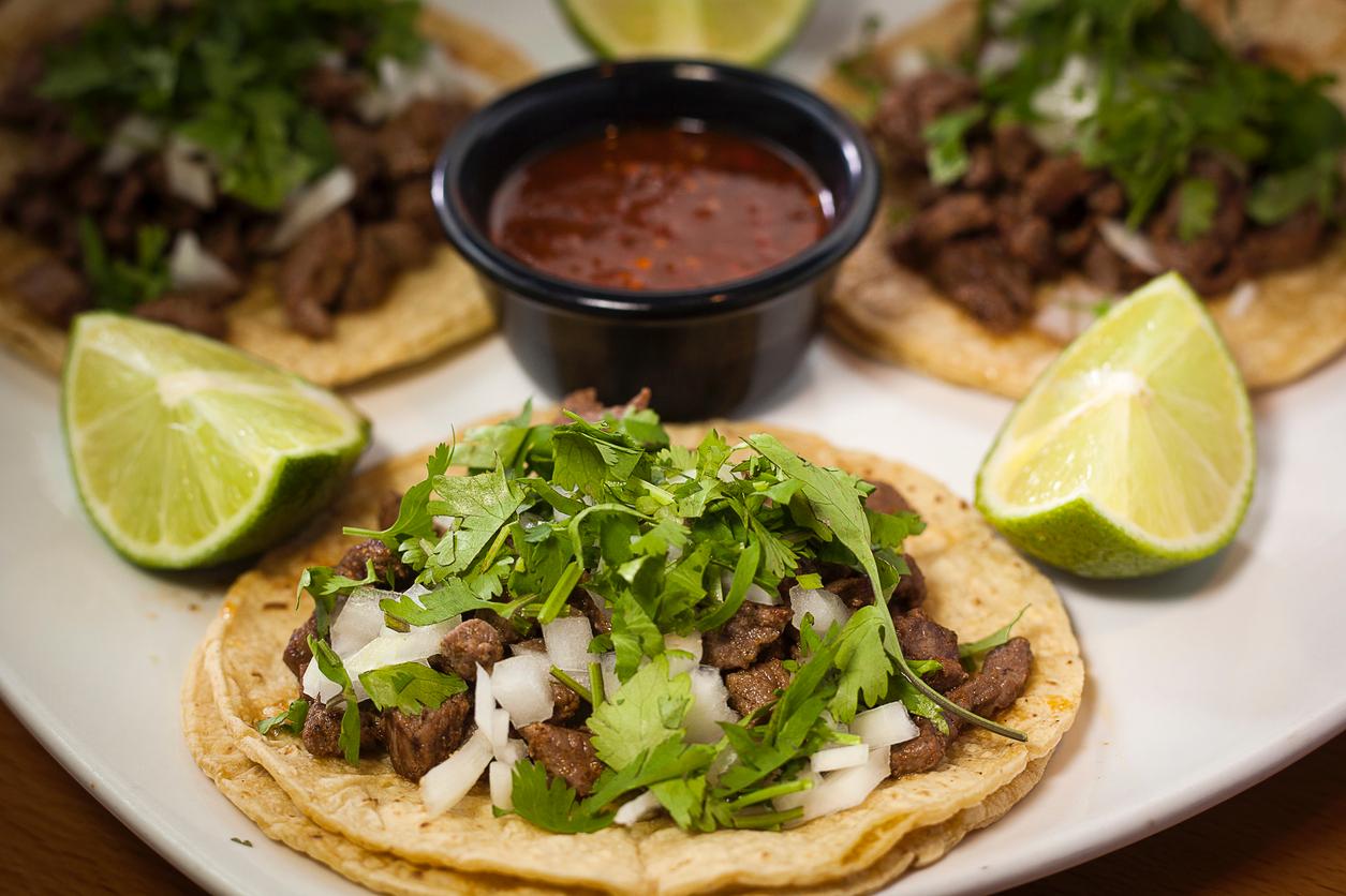 Taco de bistek en tortilla de harina acompañado de salsas cebolla limon