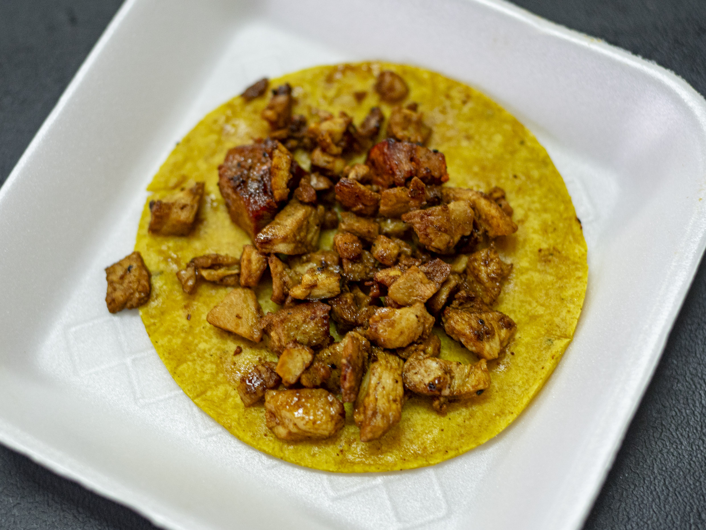 Carne de chuleta a la plancha, aderezada con nuestra receta secreta, acompañado de tortillas, salsa, limones, crema de ajo, cebolla y salsa.