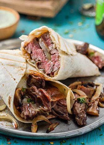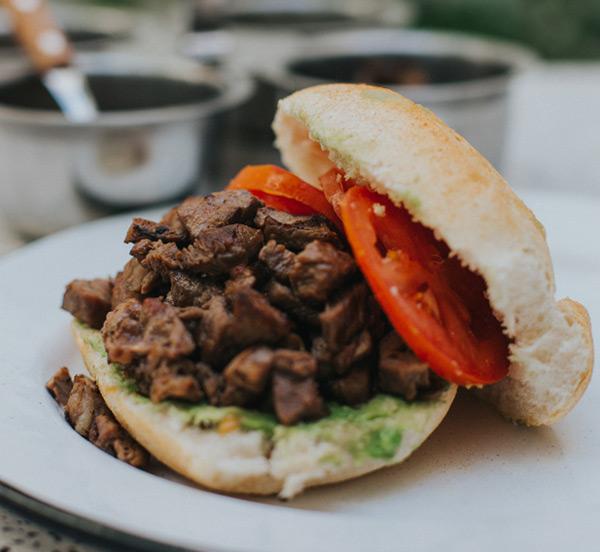 Carne de bisteck a la plancha, con nuestra receta secreta, acompañado de cebolla, limones, salsas, tortillas, crema de ajo charros y guacamole.