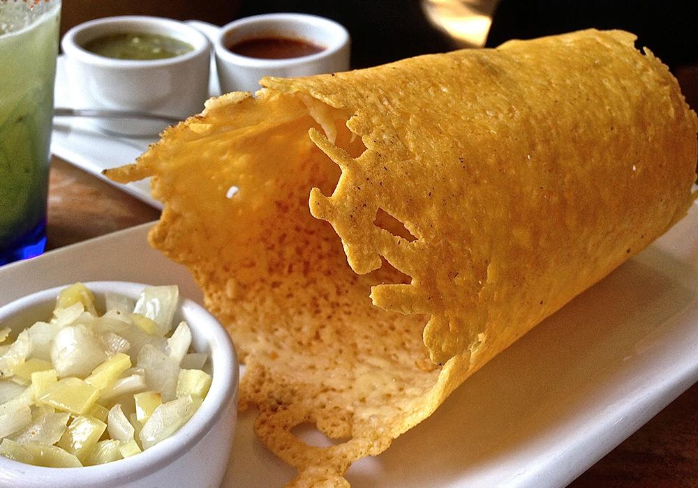 Taco de harina con chuleta y queso acompañado de salsas crema de ajo cebolla