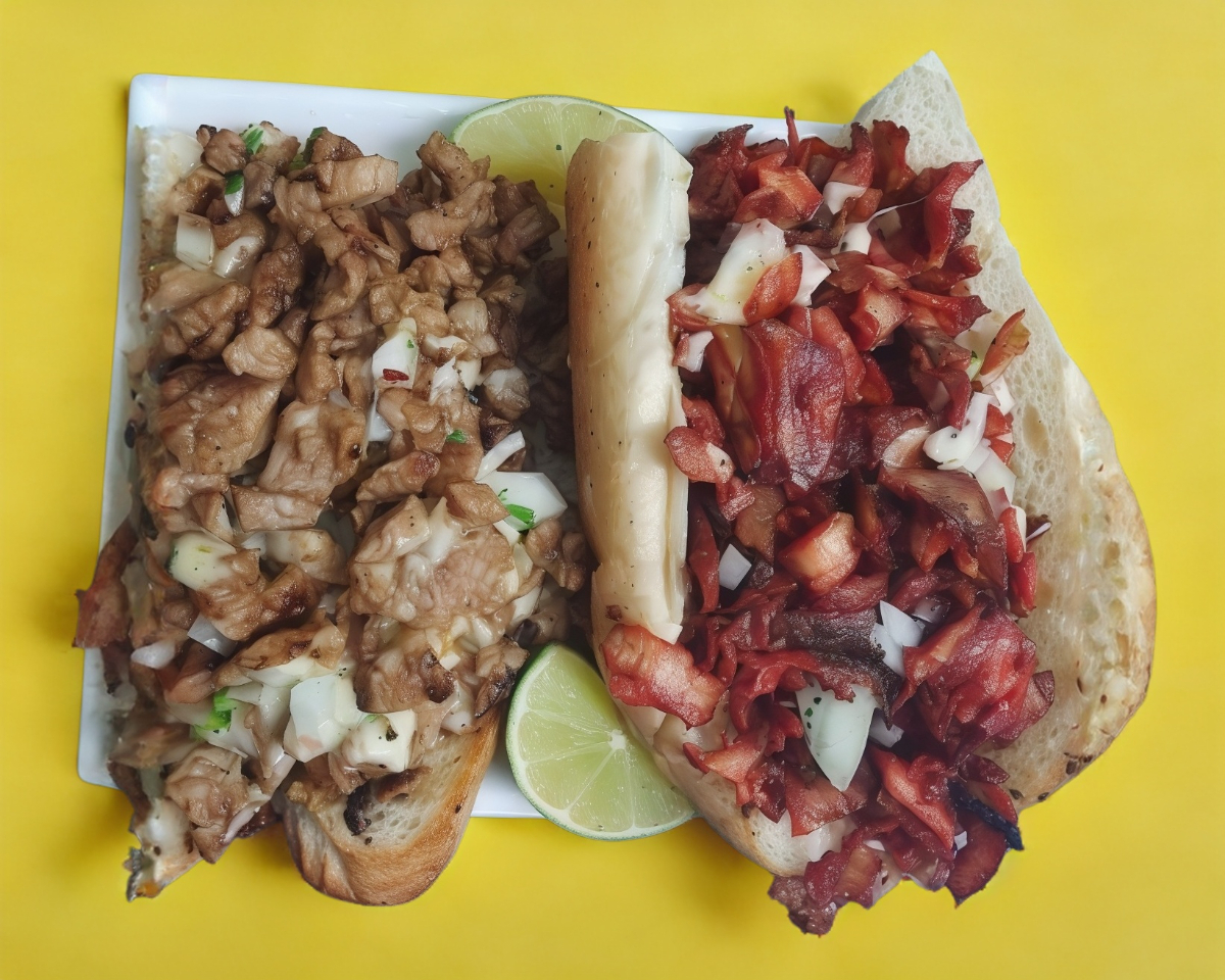 Bolillo, cebolla aparte limón, piña, limones, salsa.