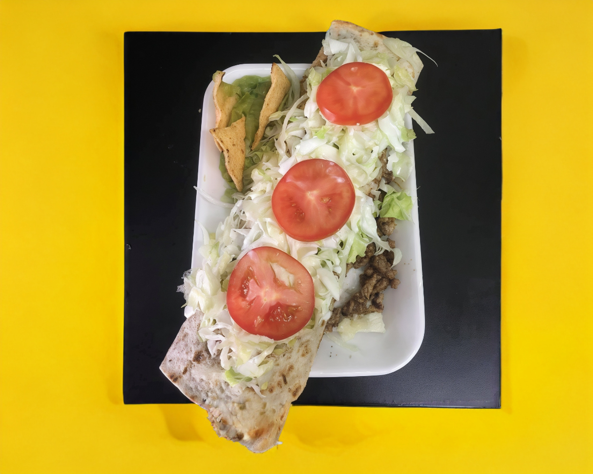 Tortilla harina queso y carne, cebolla aparte limón, limones, salsa.