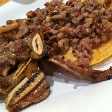 TACO DE LONGANIZA CON COSTILLA DE RES, CEBOLLA, CILANTRO, SALSA, LIMÓN