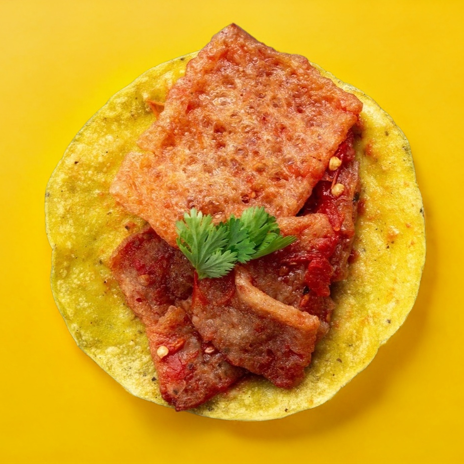 🌮 Taco de chicharrón en salsa roja: tortilla calientita hecha a mano, que abraza un chicharrón suave y jugoso, bañado en una salsa roja casera, llena de sabor y un toque picosito que despierta el paladar. ¡Un bocado que te hará volver por más!