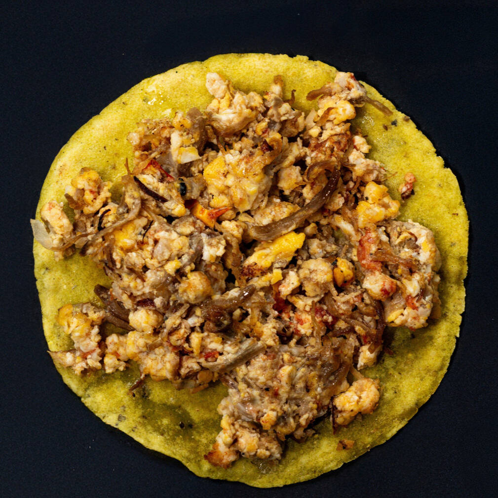 🌮 Taco de trapo viejo: tortilla hecha a mano, recién salida del comal, que envuelve carne de res deshebrada mezclada con huevo revuelto, guisada con jitomate, cebollita, chile y especias, creando un relleno jugoso y lleno de sabor casero. ¡Tradición que se disfruta en cada bocado!