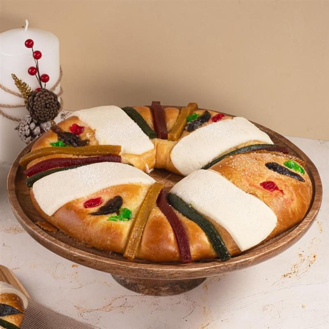 Tradicional rosca de reyes, rellena de queso crema, decorada con frutas cristalizadas. Contiene 3 muñecos.