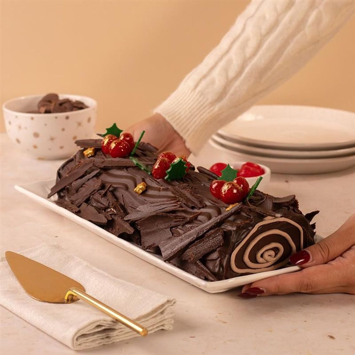 Delicioso rollo relleno de queso crema y fresas, bañado de tres leches, cubierto con chocolate.