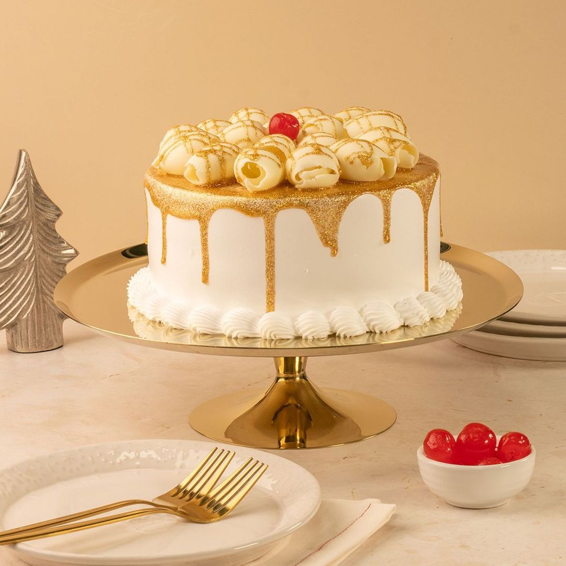Exquisito pastel elaborado con tres rellenos: nuez, fresa con queso y durazno con queso, bañado con un delicioso jarabe de tres leches, cubierto con crema chantilly, decorado con finos rollos de chocolate blanco.