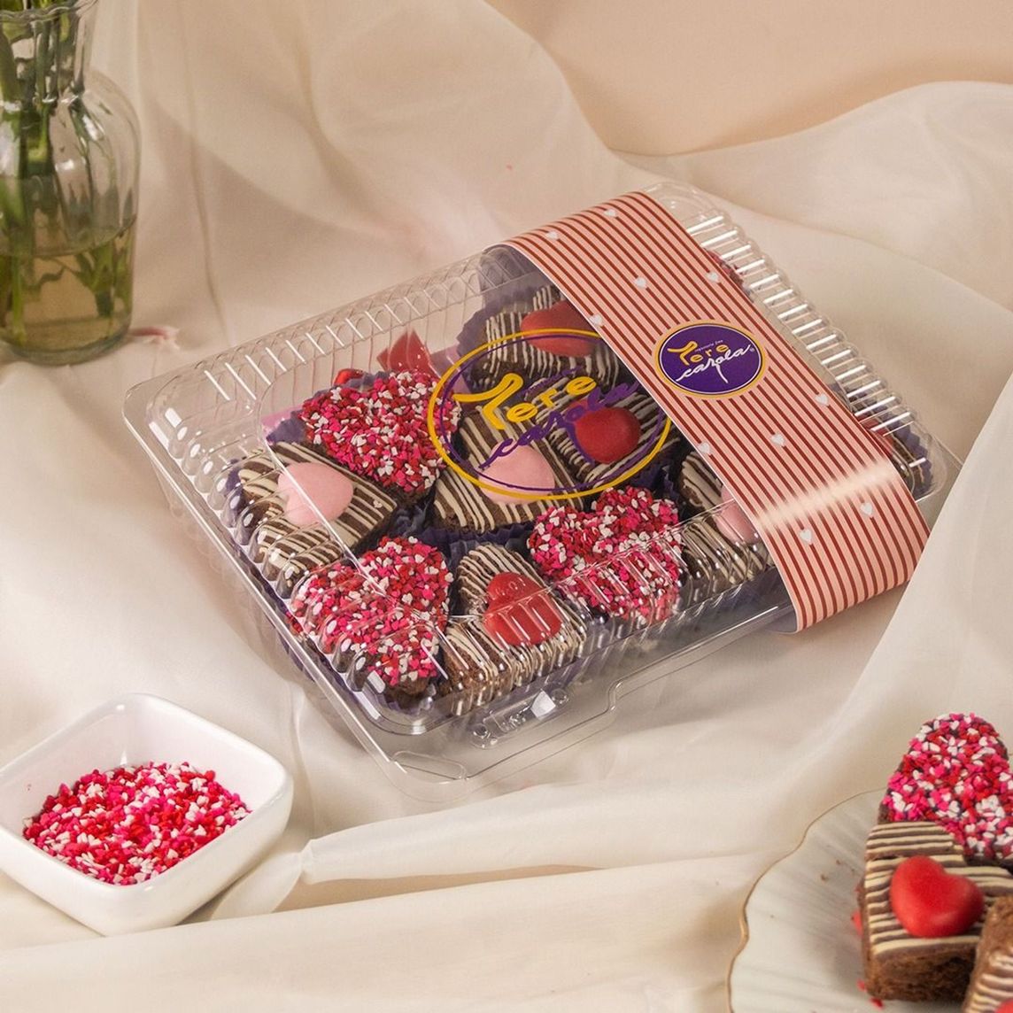 Domo con brownies en forma de corazón decorados. Contiene 12 brownies decorados con granillos, chocolate blanco o corazón de chocolate color rosa