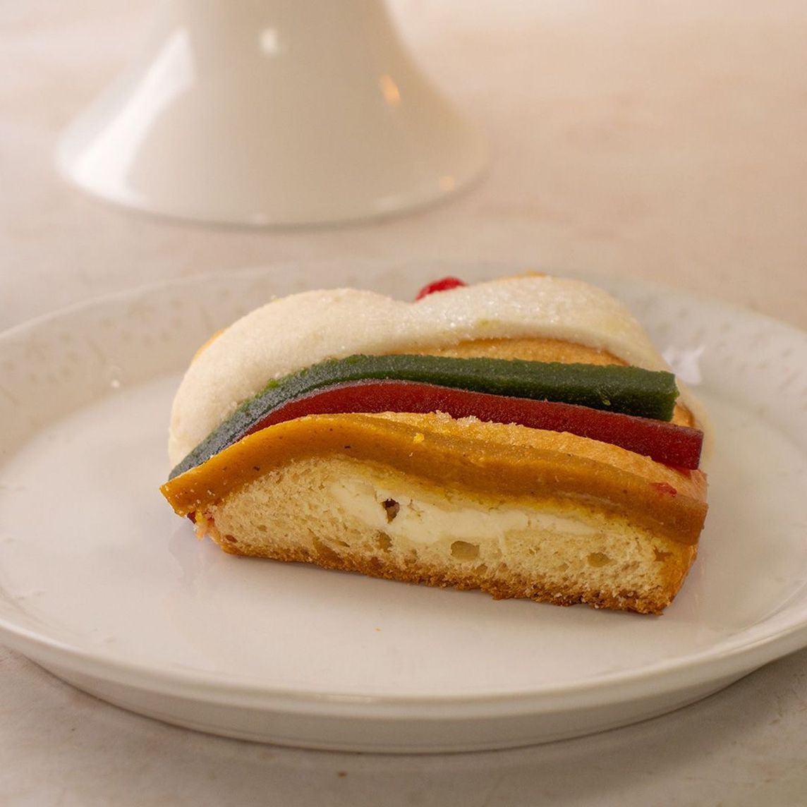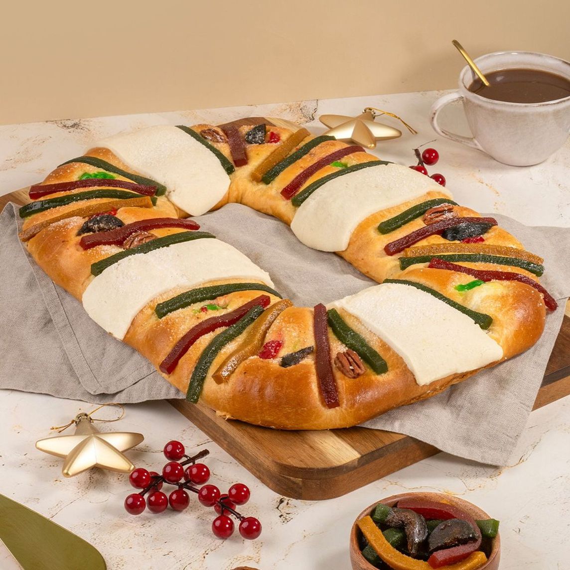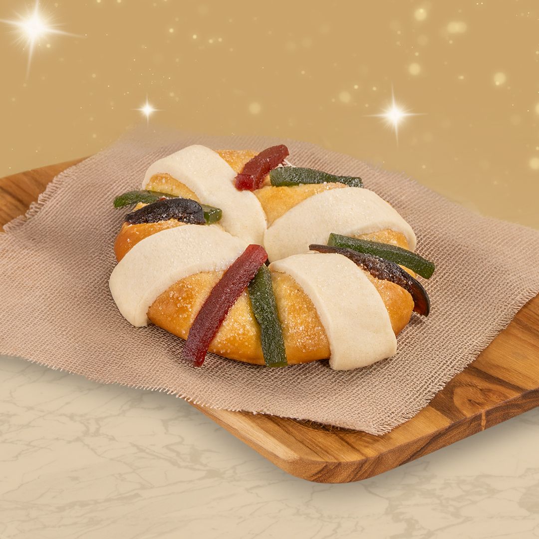 Tradicional rosca de reyes, rellena de queso crema, decorada con frutas cristalizadas.