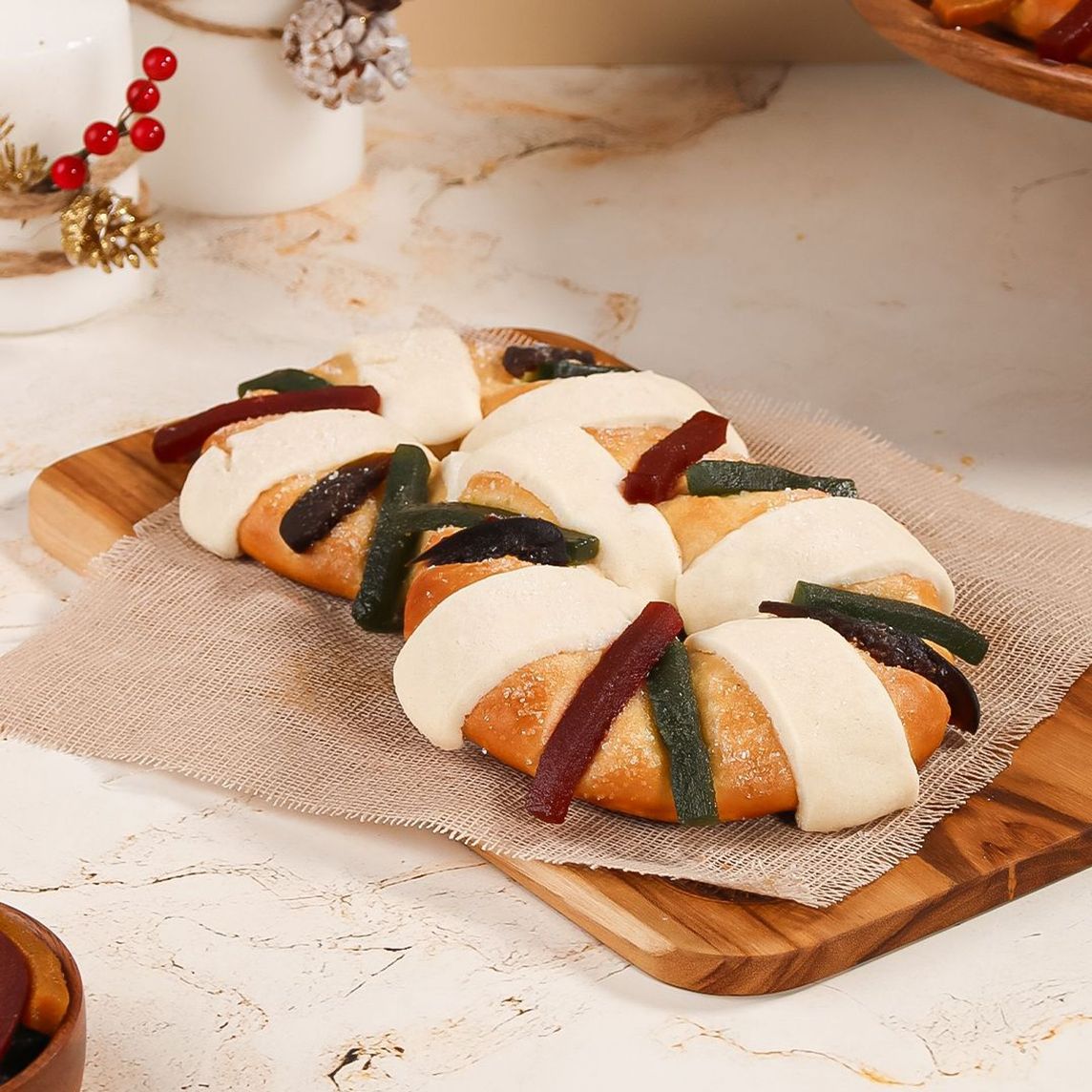 Tradicional rosca de reyes, rellena de queso crema, decorada con frutas cristalizadas. Contiene 1 muñeco.
