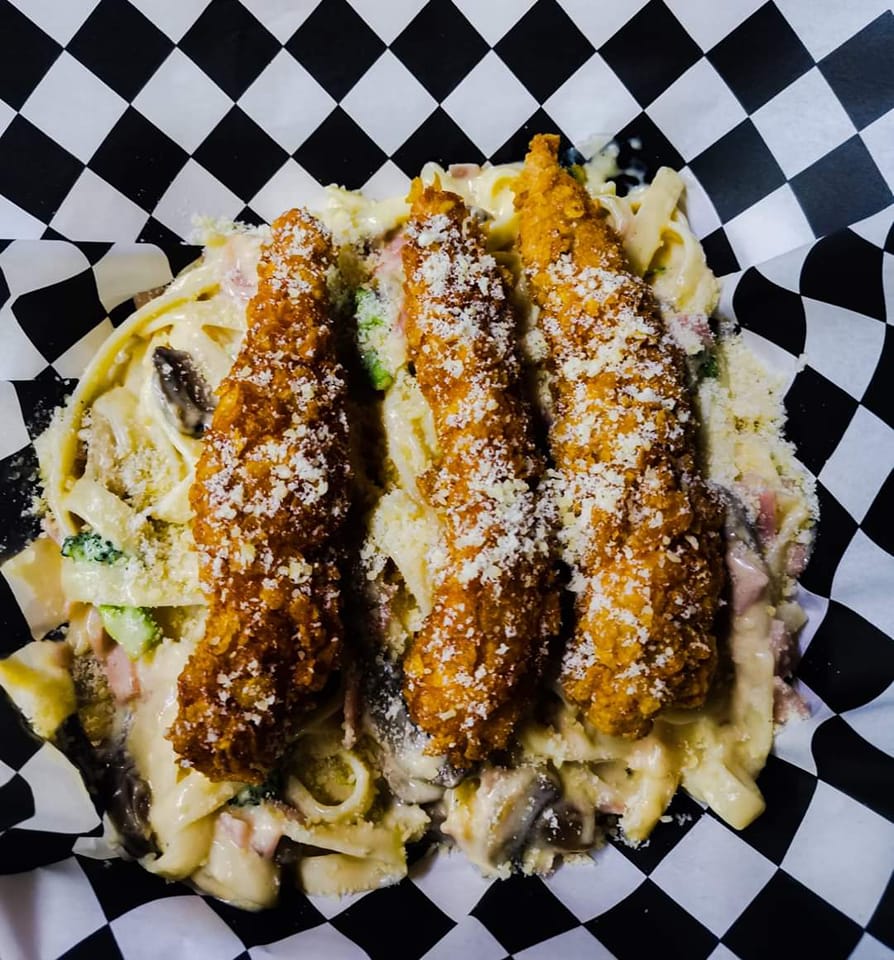 Porción de pasta Fetuccini bañada en salsa alfredo con queso parmesano y tiras de pollo crispy