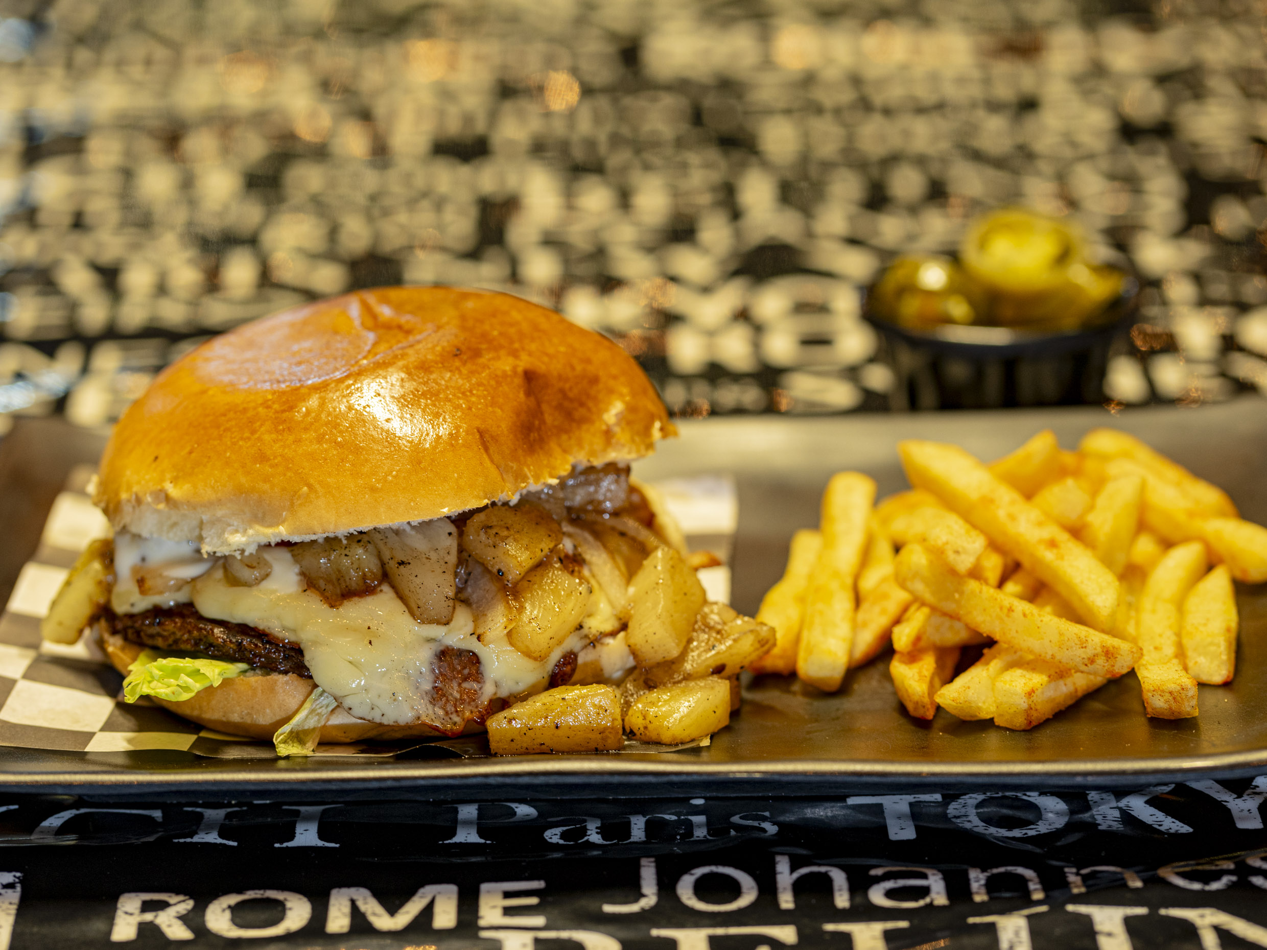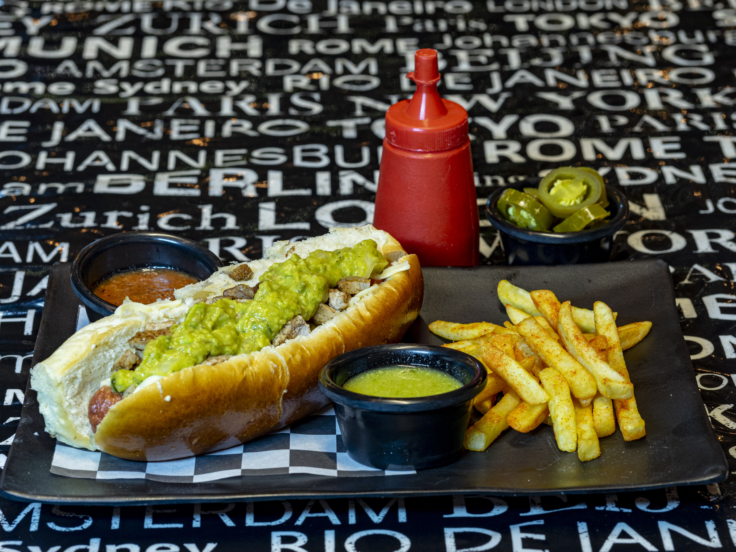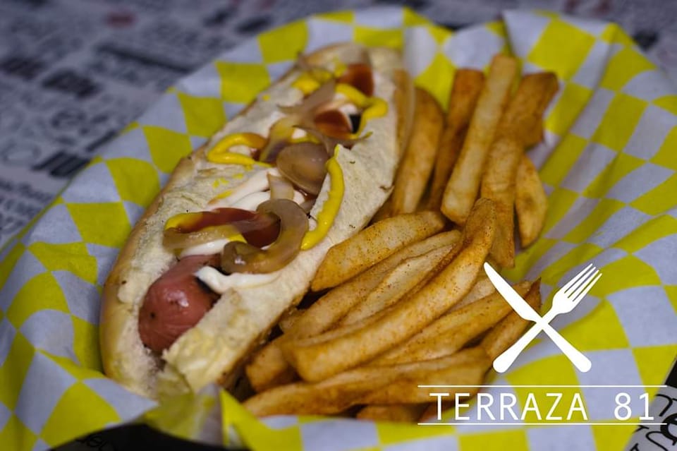 Pan brioche de 15 cm, salchicha de pavo, carne asada con queso gratinado y guacamole. Incluye papas a la francesa.