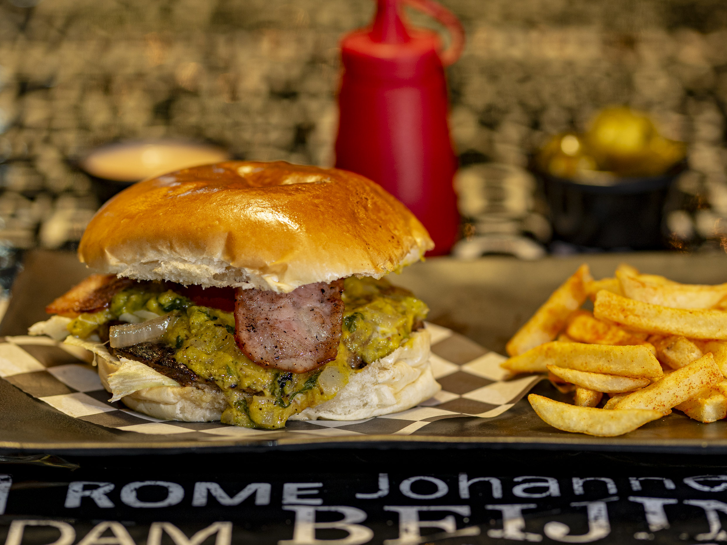 Pan brioche, carne de res, guacamole de la casa, tocino, vegetales y aderezos base.