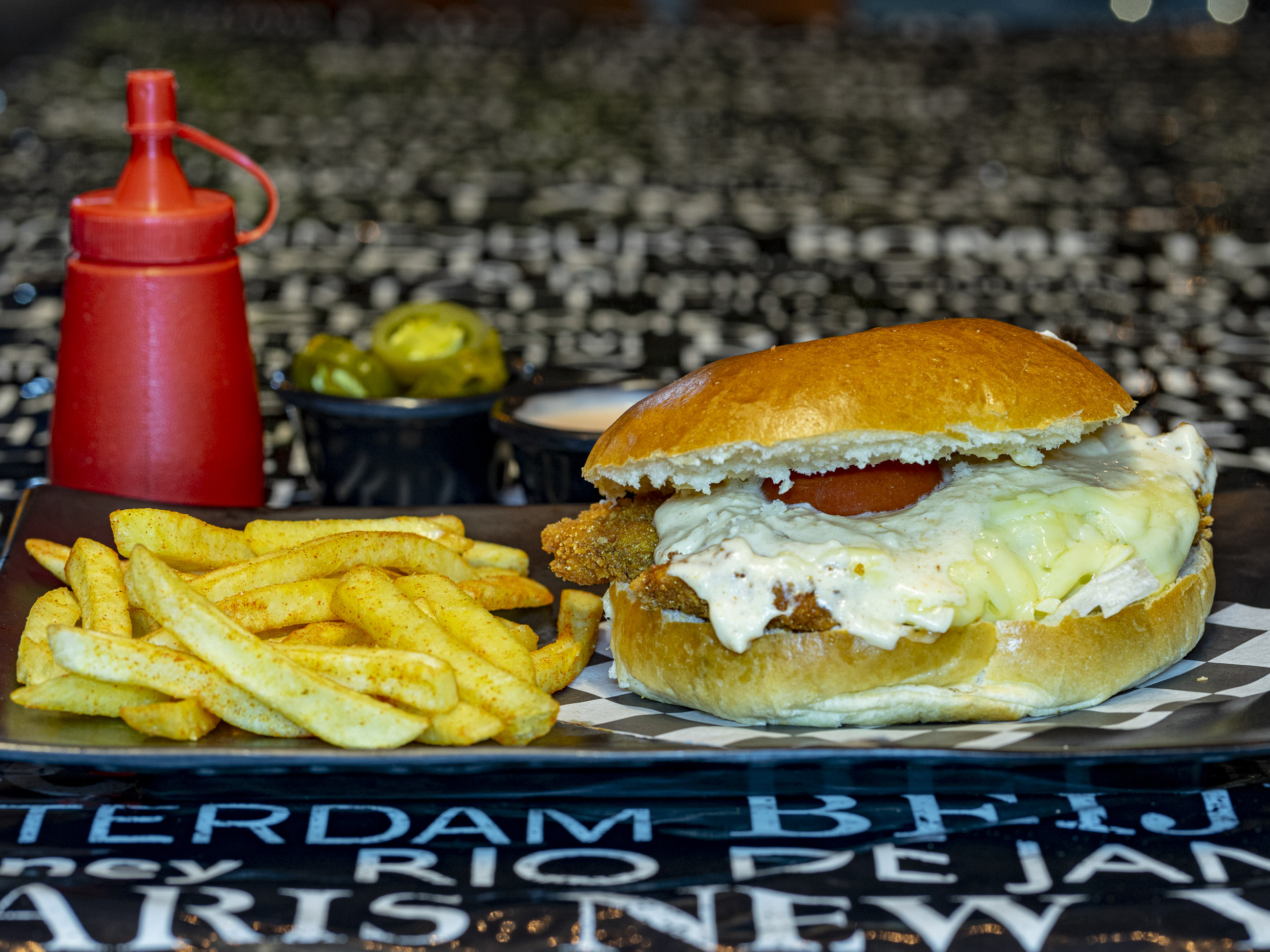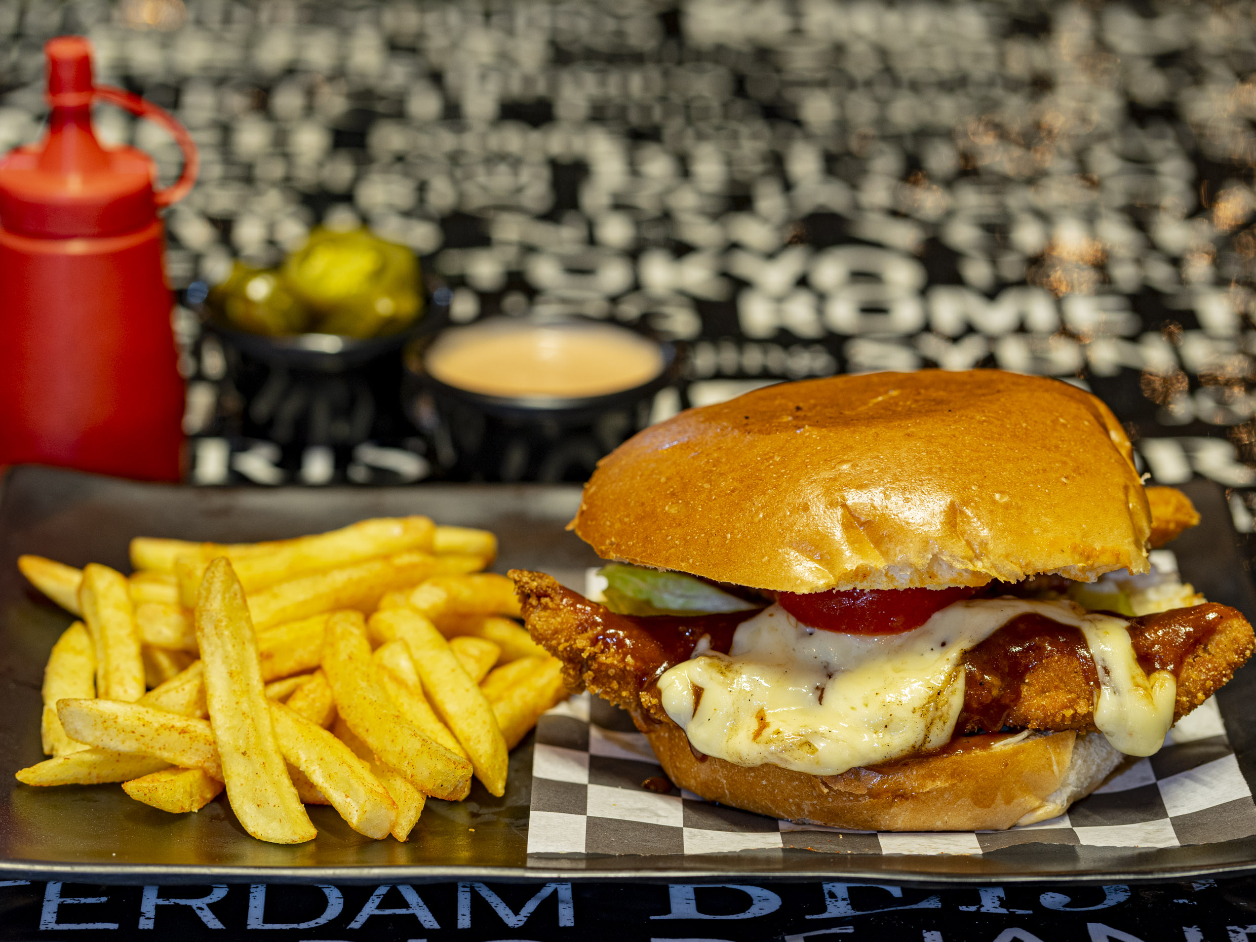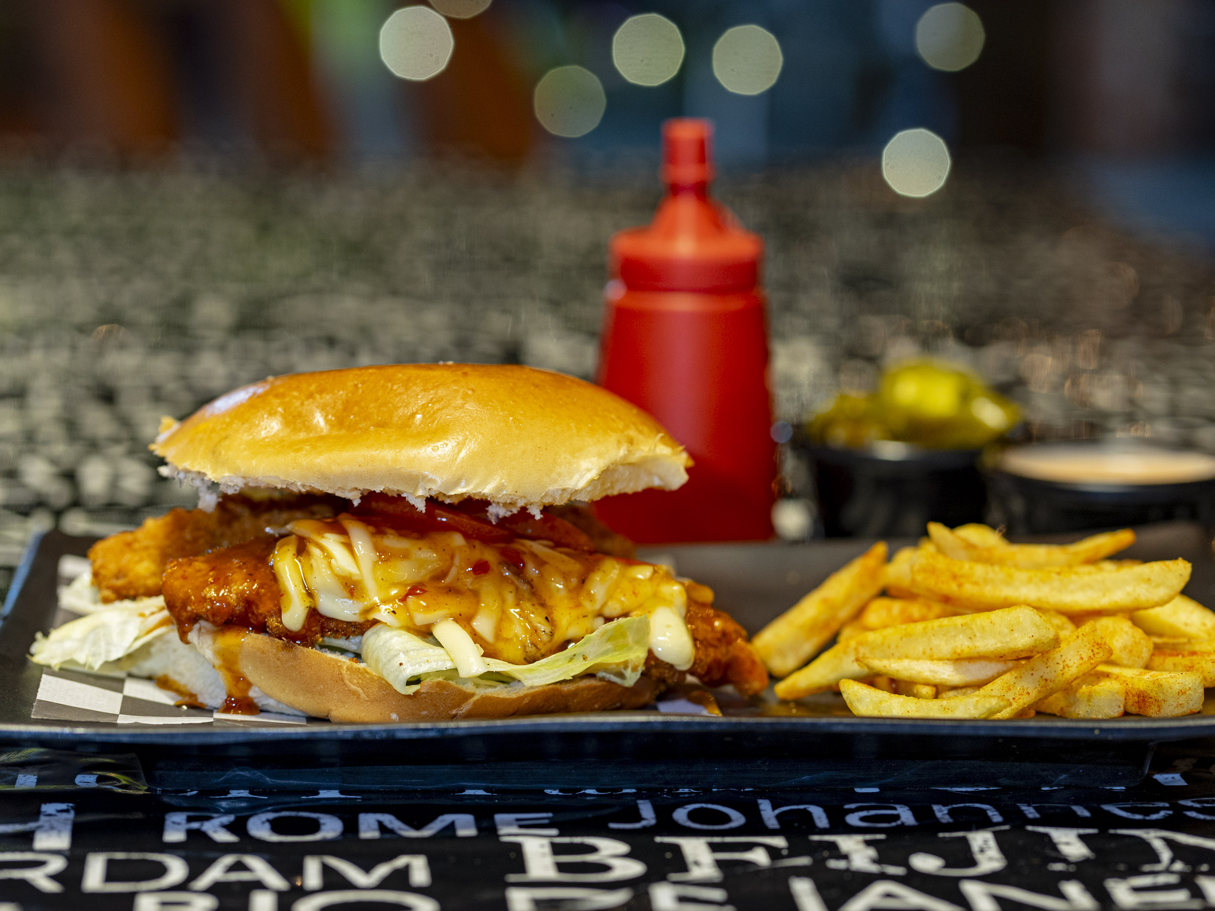 Pan brioche, lechuga, 4 tiras de pollo crispy, queso gratinado, mayonesa y tomate.