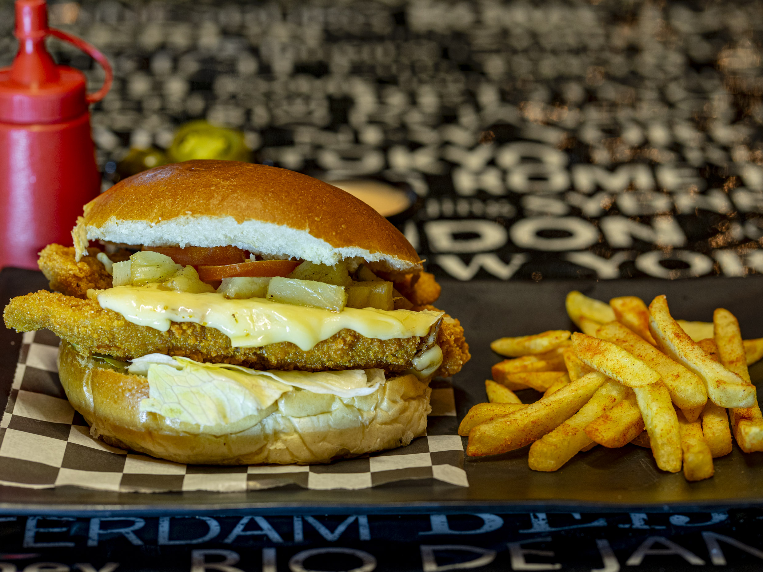 Pan brioche, 2 tiras de pollo crispy, piña con queso gratinado, lechuga, tomate y mayonesa.