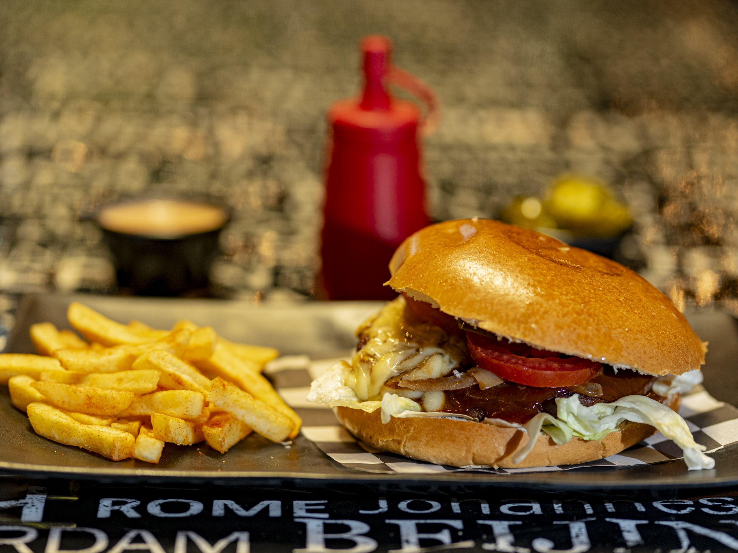 Pan brioche, carne de res en aderezo BBQ, queso gratinado, vegetales y aderezos base.