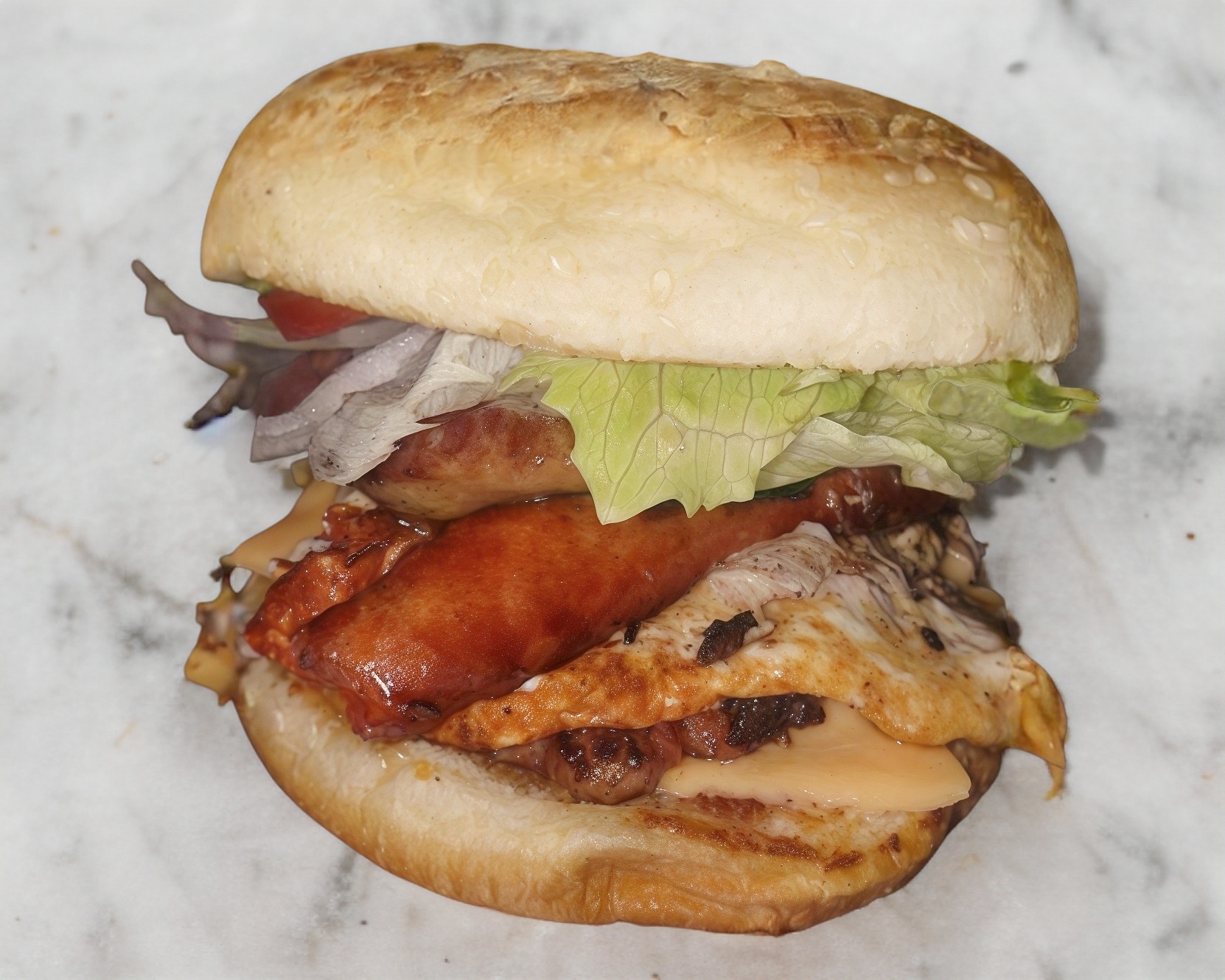 2 Carnes de 120 gramos de carne 100% res, queso americano, queso oaxaca, porción de chistorra, chorizo argentino, vegetales