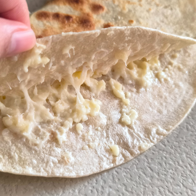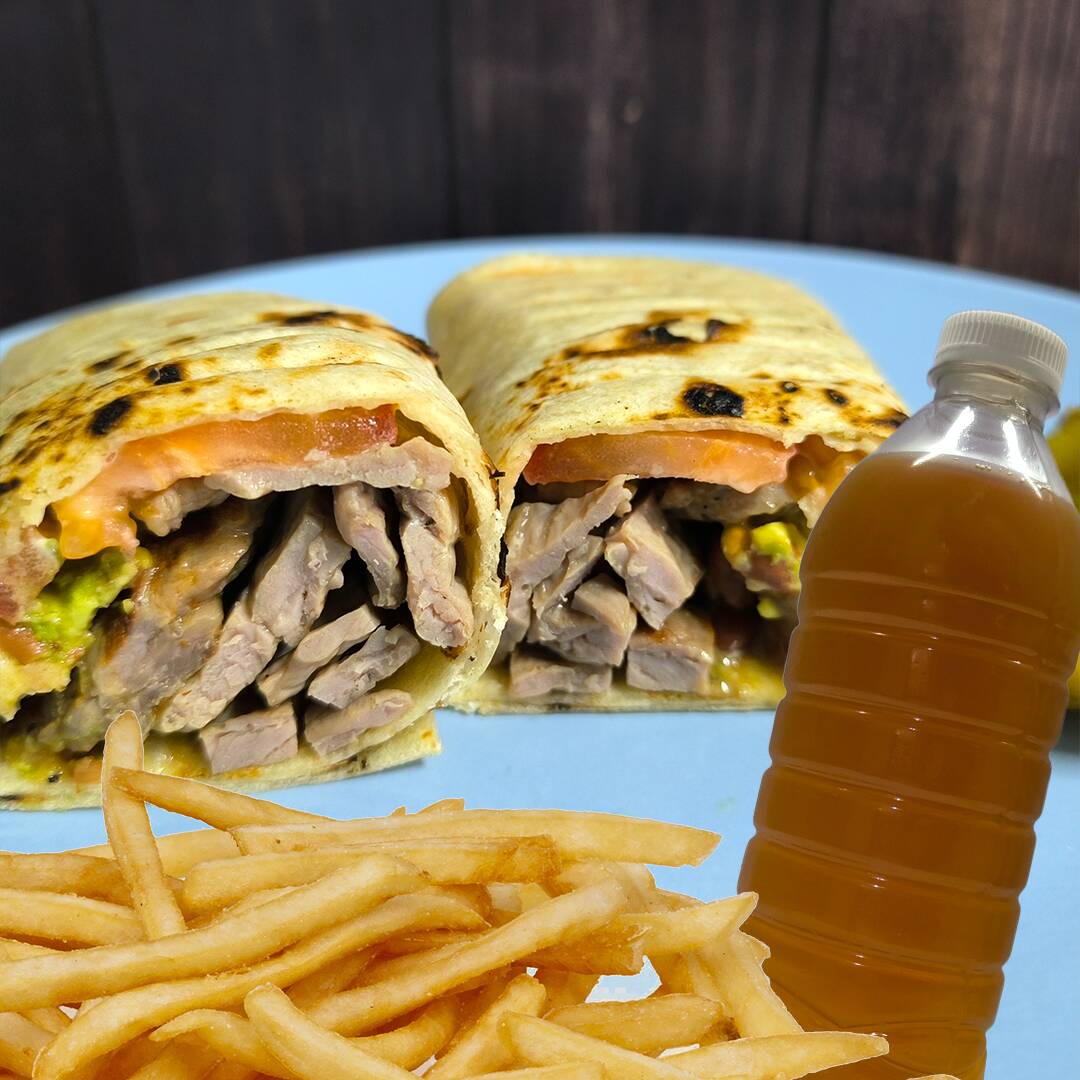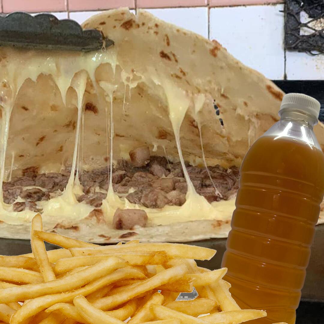 Tortilla de harina XL rellena de queso derretido. Incluye papas a la francesa individuales y té de medio litro. Con salsa y jalapeño aparte.