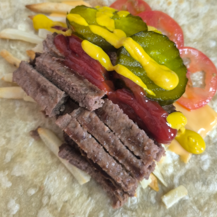 Burrito de 300g relleno de deliciosa carne de hamburguesa, papas a la francesa, tomate fresco, pepinillos, mayonesa, ketchup y mostaza. Acompañado de una orden de aros de cebolla y Té de medio litro. Jalapeños y ketchup aparte.