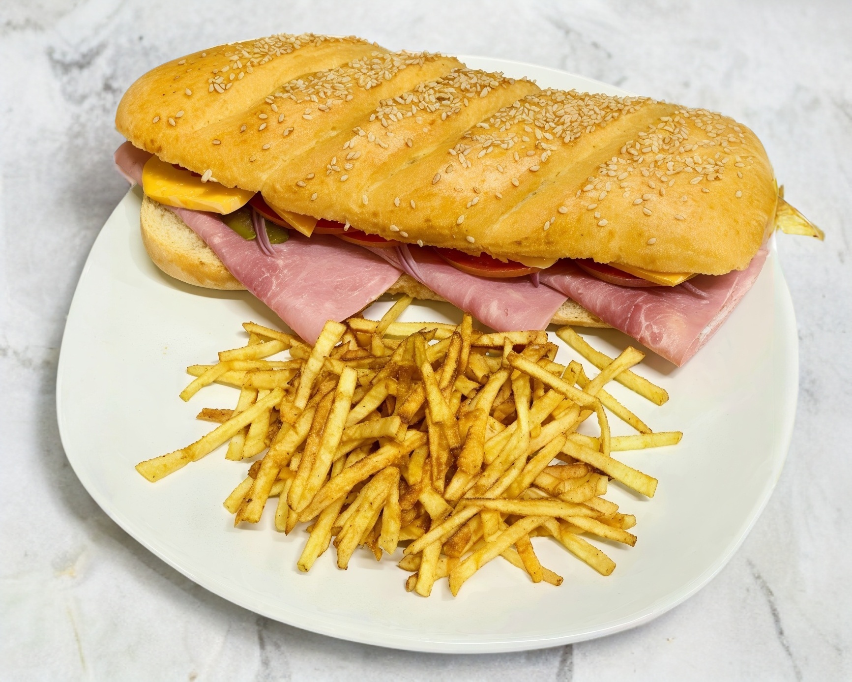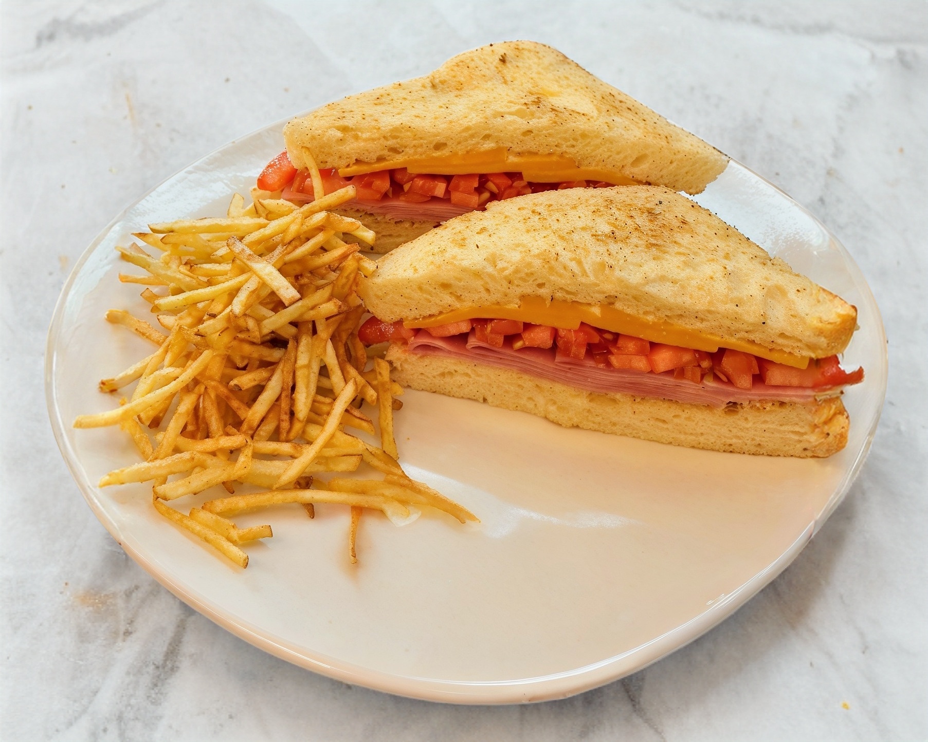 Jamón de cerdo, queso cheddar, tomate, mayonesa, mostaza, cátsup, papatinas