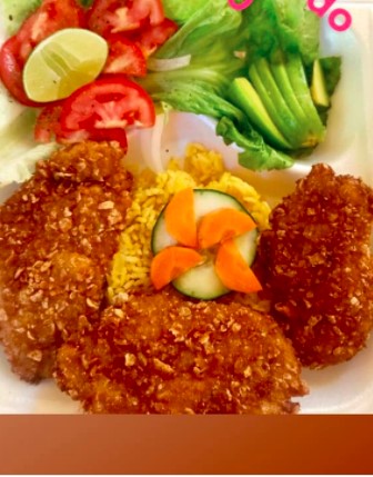 3 Bolitas de arroz empanizadas, por dentro trae pollo crispy y philadelphia.