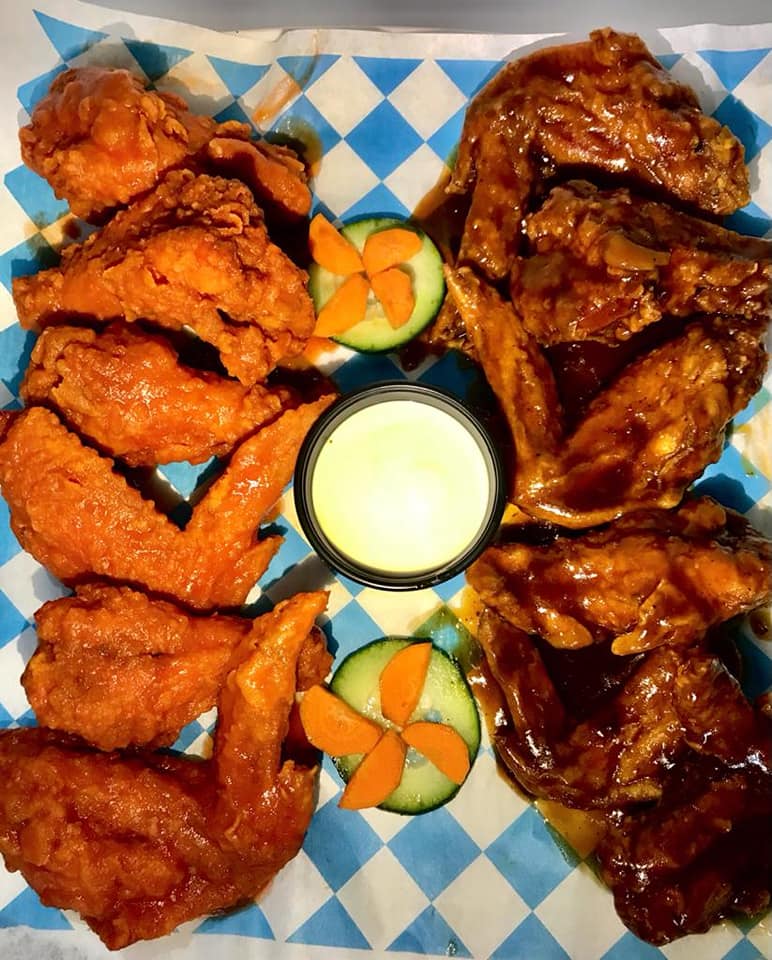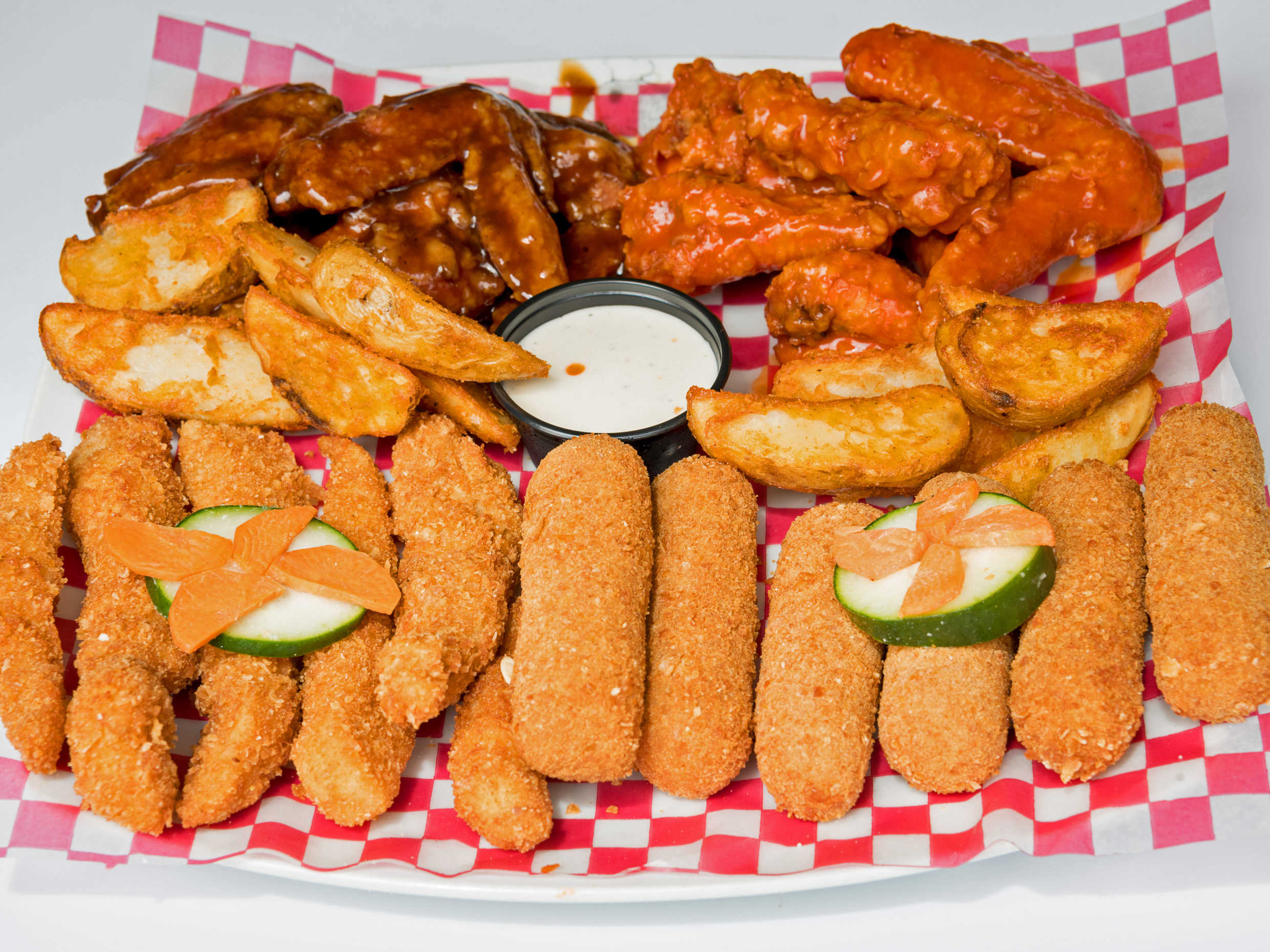 Contiene: 10 Alitas, 6 Dedos de queso, 6 Tiras de pollo Crispy, Papas gajo, Acompañado de Aderezo Ranch y Flor de Pepino con Pétalos de zanahoria.