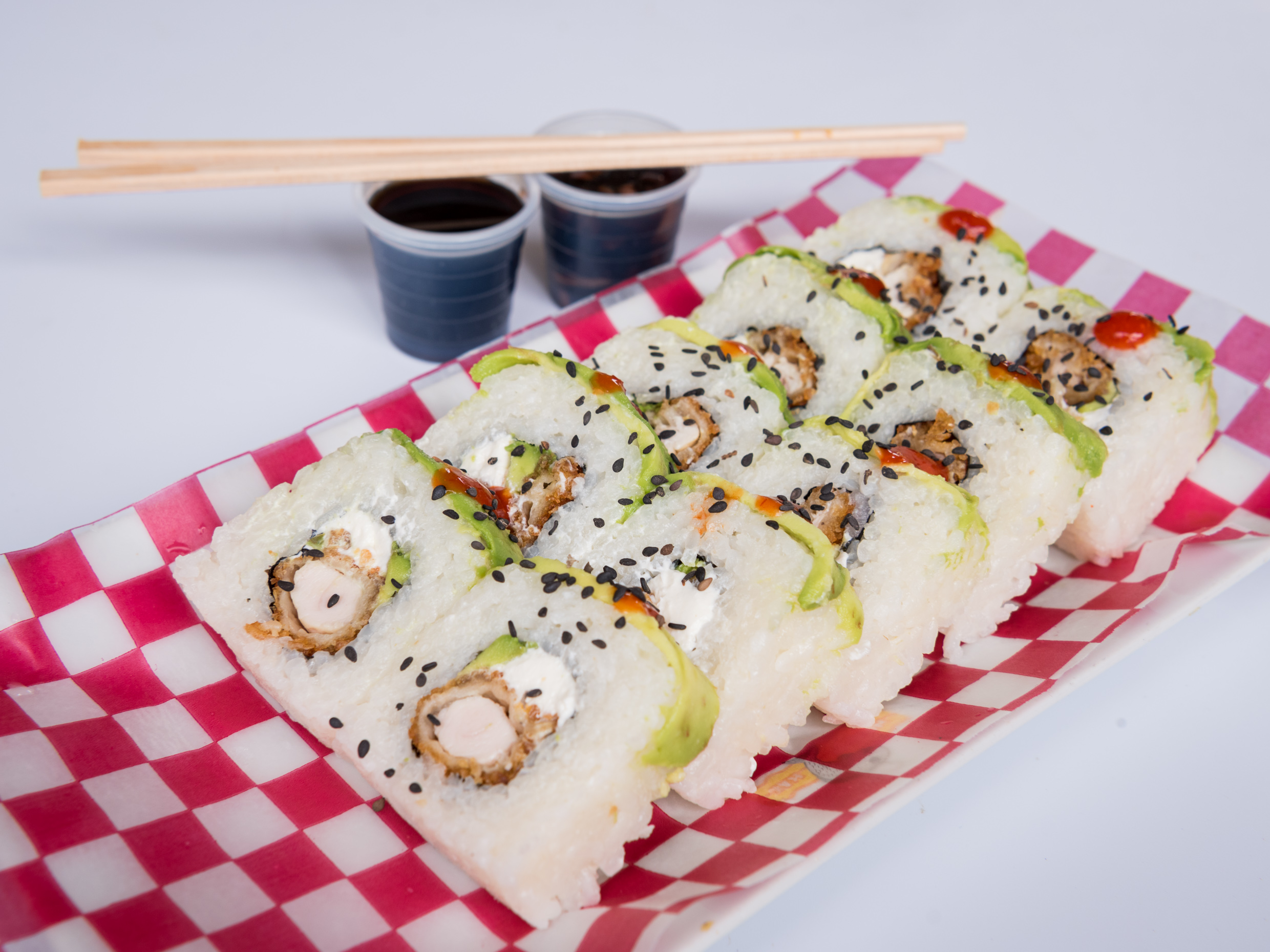 PD: Alga, Philadelphia, Aguacate y Pollo Crujiente. PF: Una Capa de Aguacate con puntos de Sriracha y ajonjolí.