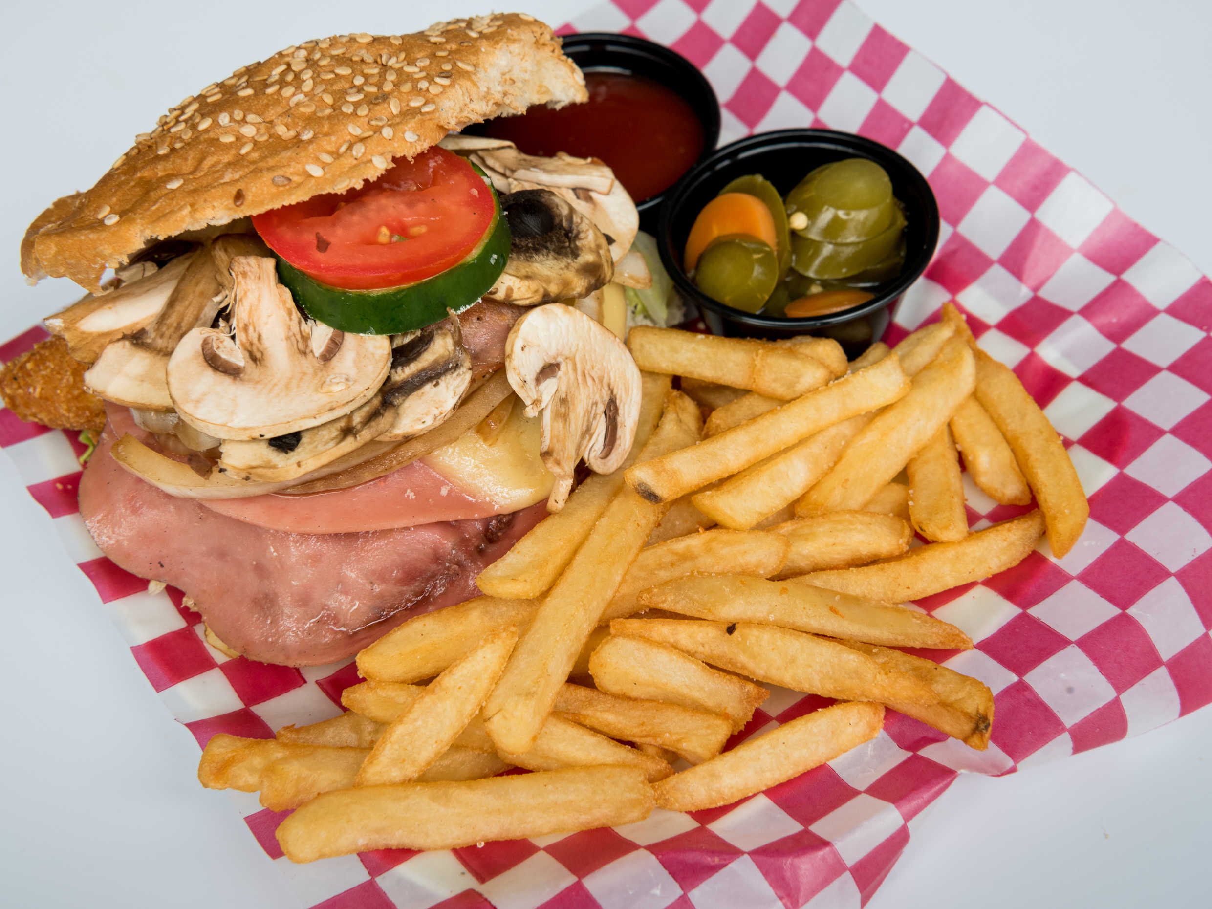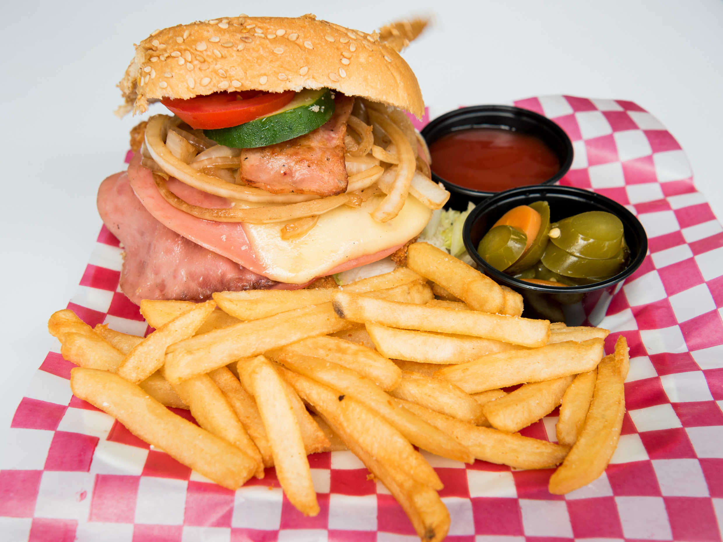 Tiras de Pollo Crujientes, jamón, queso, tocino, mezcla de vegetales, catsup, mayonesa, mostaza, aros de cebolla empanizados y papas a la francesa.