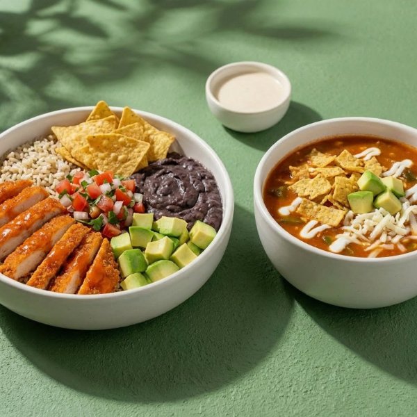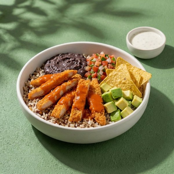 Bowl a base de arroz integral con pollo empanizado, fríjoles refritos, pico de gallo, aguacate, totopos y vinagreta a elección. El tamaño perfecto para que lo acompañes con una sopa o wrap.