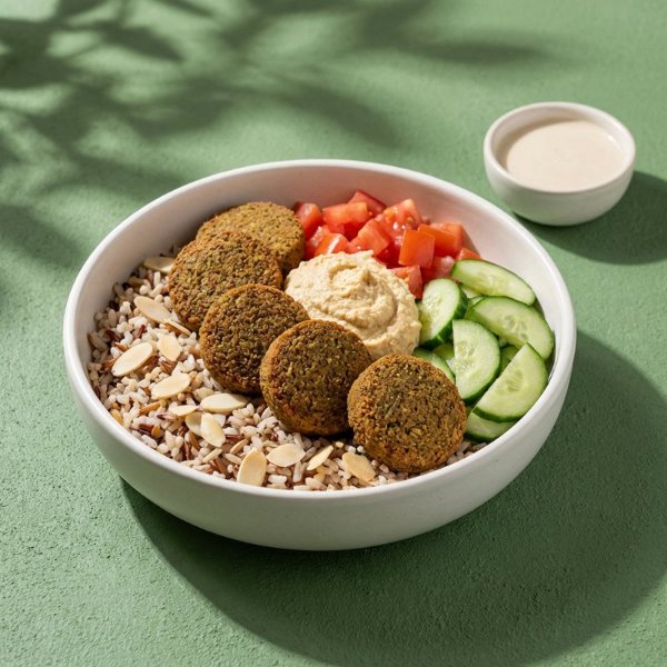 Bowl a base de arroz integral y almendras con falafel (5 unds), hummus de garbanzo, jitomate, pepino, perejil y vinagreta a elección. El tamaño perfecto para que lo acompañes con una sopa o wrap.