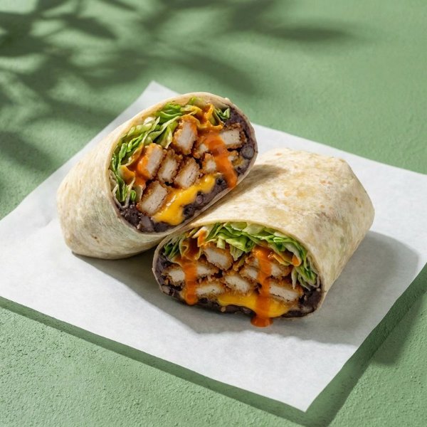 Wrap en tortilla de harina relleno con pollo empanizado, queso cheddar, fríjoles,lechuga y salsa buffalo.