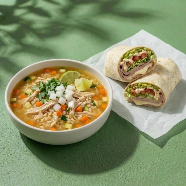 Combo que incluye una sopa del día y un wrap a elección, todo preparado con ingredientes frescos y de calidad.