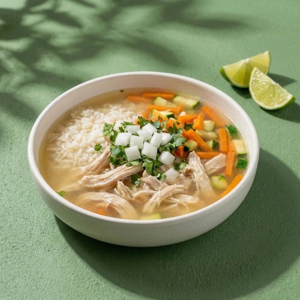 Consome con pechuga de pollo (32g.), arroz, zanahoria y zucchini, acompañado con cebolla, cilantro y limón.