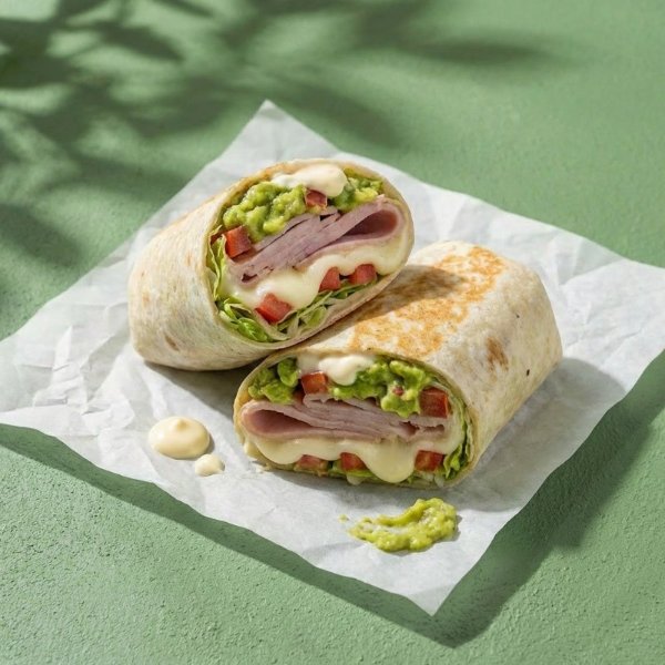 Wrap en tortilla de harina relleno con jamón de pavo, queso mozzarella, lechuga, jitomate, guacamole y alioli.