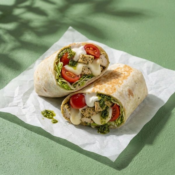 Wrap en tortilla de harina relleno con pollo pesto, queso mozzarella, jitomate, lechuga, crema y pesto.
