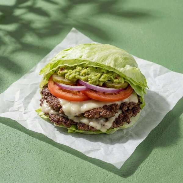 Wrap en hojas de lechuga relleno con 180gr de carne smashed de hamburguesa, queso mozzarella, jitomate, cebolla, pepinillos y guacamole.
