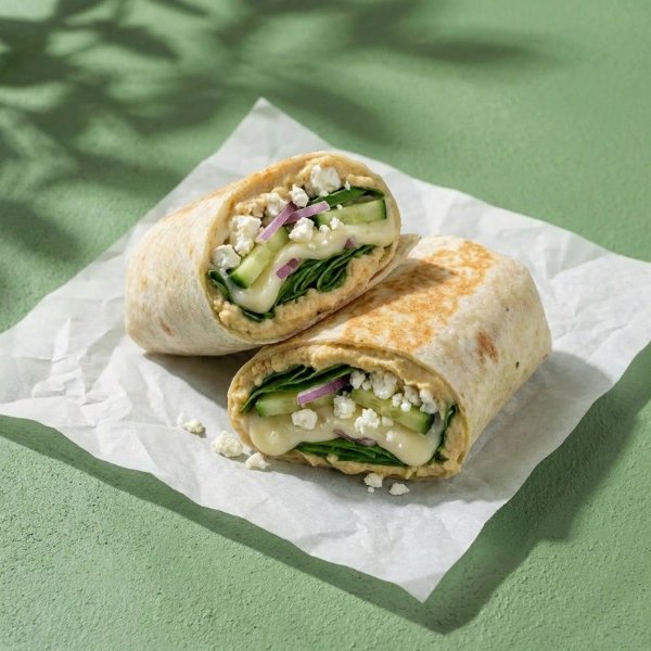 Wrap en tortilla de harina relleno con queso mozzarella, queso feta, pepino, cebolla morada, espinaca, hierbabuena y hummus.