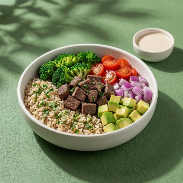 Bowl a base de arroz integral con arrachera, brócoli, tomate cherry, cebolla morada, aguacate, cilantro y vinagreta a elección. El tamaño perfecto para que lo acompañes con tu sopa o wrap favorito.