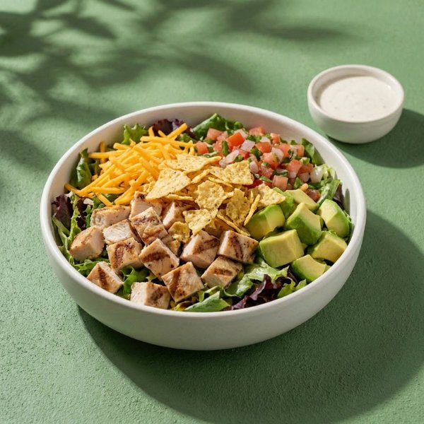 Ensalada a base de lechuga con pollo en cubos, queso cheddar, pico de gallo, aguacate, totopos triturados y aderezo a elección. El tamaño perfecto para que la acompañes con una sopa o wrap.