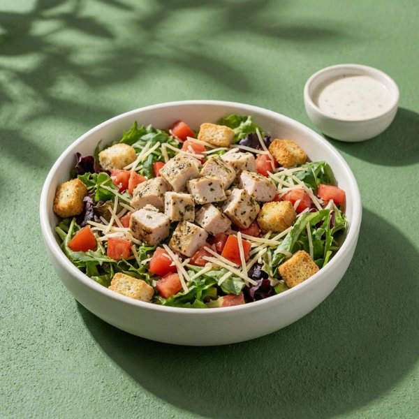 Ensalada a base de lechuga con pollo pesto, queso parmesano, jitomate, crutones y aderezo a elección. El tamaño perfecto para que la acompañes con una sopa o wrap.