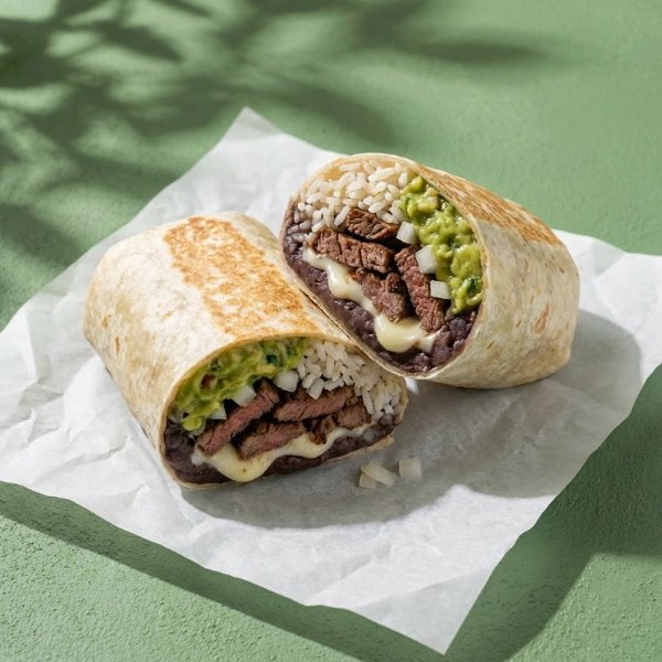 Tortilla de harina rellena de arrachera, queso mozzarella, frijoles, arroz blanco, guacamole y salsa de la casa.