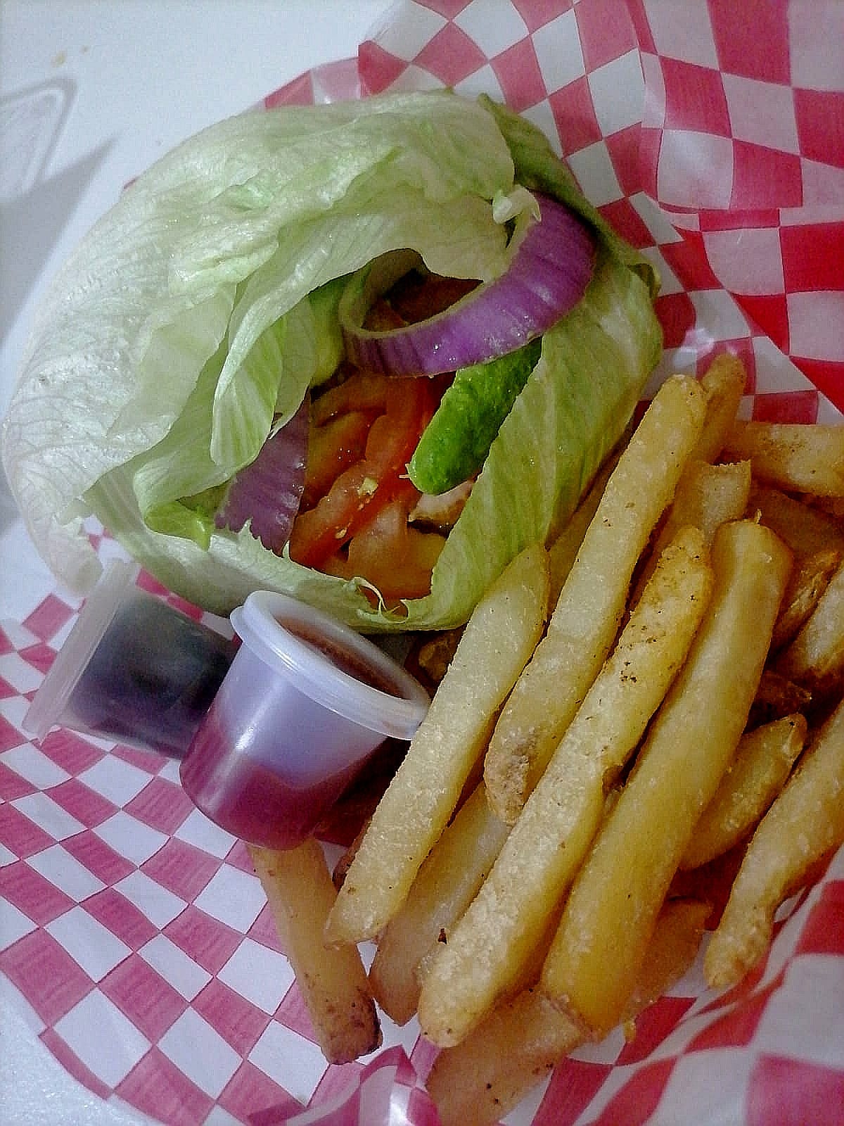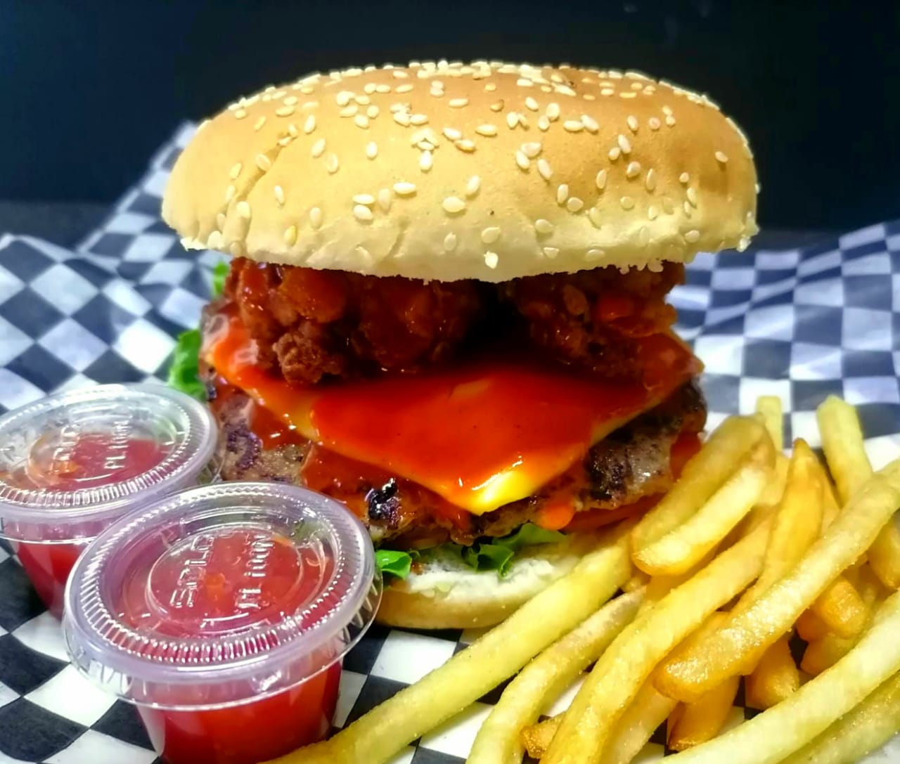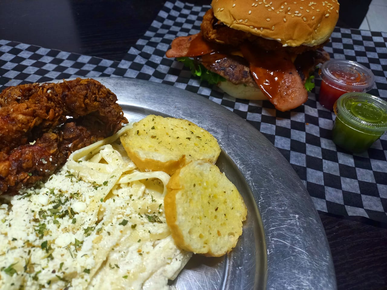 Deliciosa carne de hamburguesa, elaborada con la receta casera, una rodaja de queso americano, jitomate, lechuga fresca, cebolla blanca y tiras de pollo krispy con nuestra deliciosa salsa BBQ