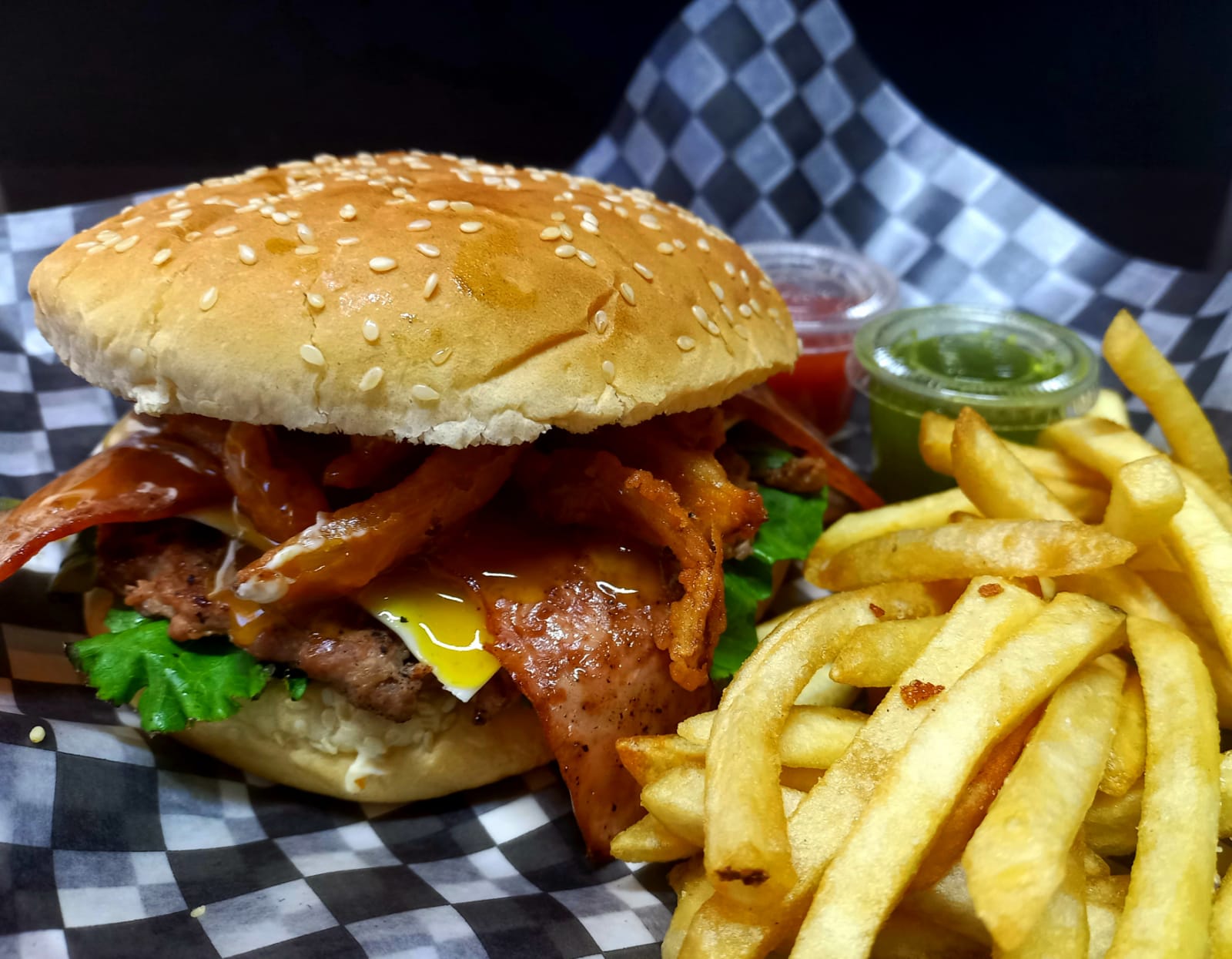 Deliciosa Hamburguesa con carne de la casa, acompañada con el delicioso sabor a tocino rebanado, salsa BBQ , Aros de cebolla, lechuga Fresca, Rodajas jitomate