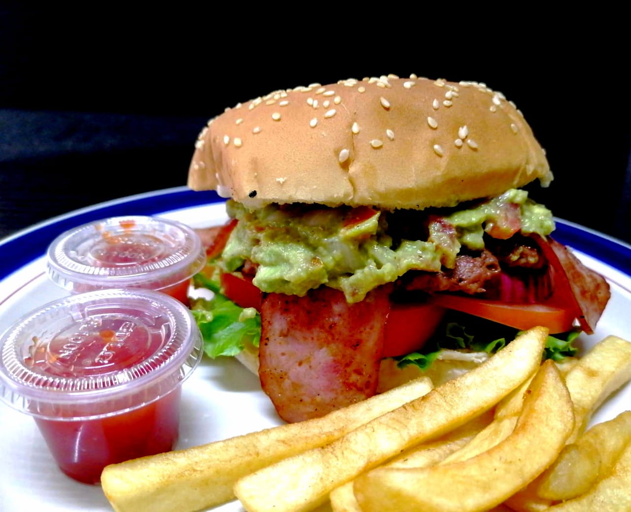 Deliciosa carne de hamburguesa, elaborada con la receta casera, una rodaja de queso americano, jitomate, lechuga fresca, cebolla morada y suculento guacamole acompañado con tiras de tocino.
