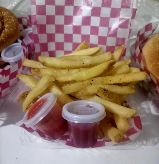 Deliciosa hamburguesa con carne de la casa, acompañada de ricas tiras Krispy, lechuga fresca, Delicioso queso Americano, Ricas rodajas de cebolla y nuestra deliciosa salsa BBQ.) + Refresco.