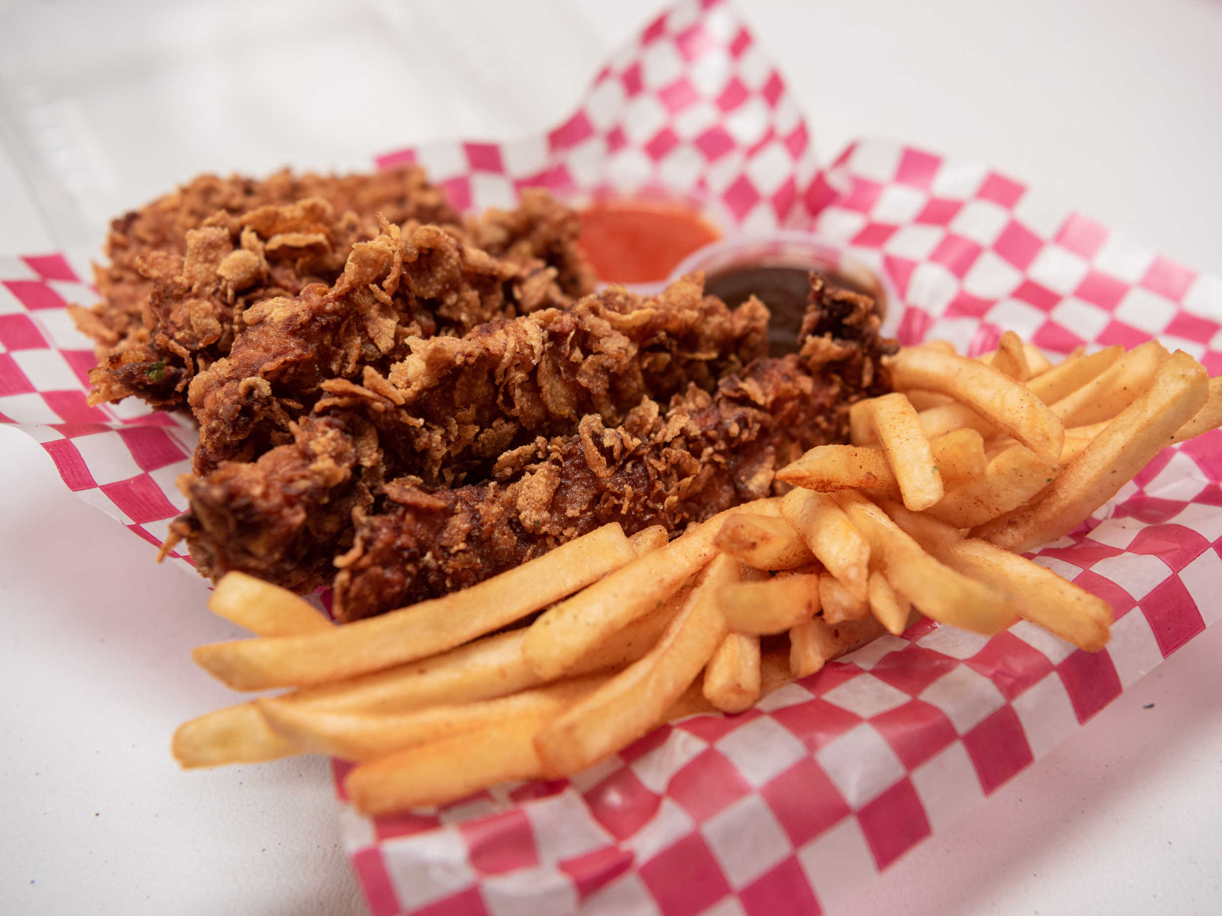 Deliciosas Tiras de Pollo, Crujientes e incomparables en cada bocado, acompañadas de ricas papas a la francesa de la casa y la Salsa de su elección.